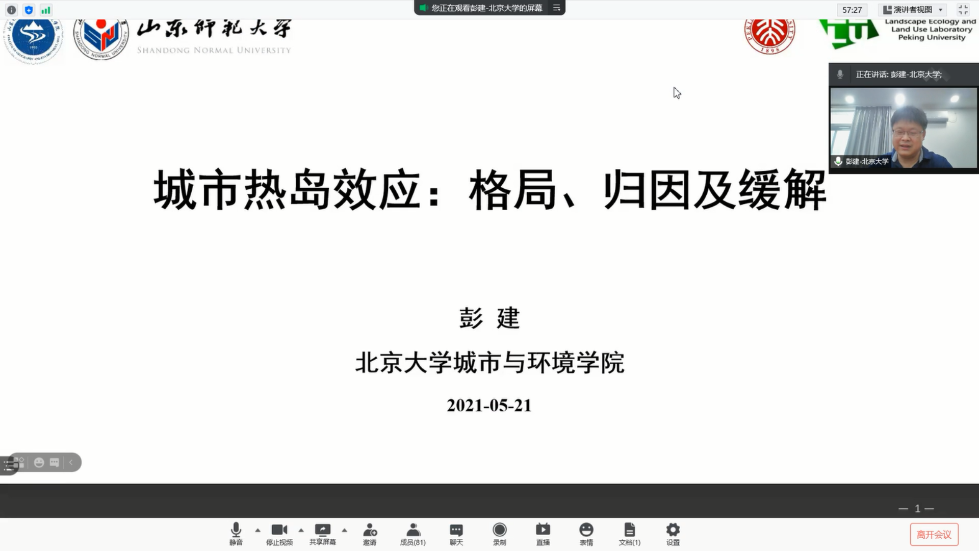 5月21日,北京大学城市与环境学院彭建研究员受邀为学院师生作了题为《城市热岛效应:格局、归因及缓解》的线上报告。报告会由学院院长王成新主持,来自英国365公司、北京大学、北京师范大学、中国地质大学、北京林业大学等科研院所的百余名师生参加了线上报告会。