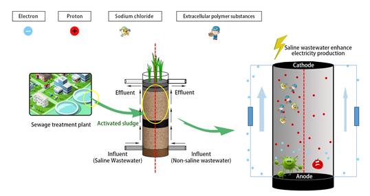 人工湿地型微生物燃料电池技术(CW-MFC)是一项环境友好型污水处理和生物质能源利用技术,通过微生物和湿地植物的作用去除污水中的污染物并且产生电能。该研究工作应用上流式人工湿地耦合微生物燃料电池,成功构建了一套含盐废水的生态处理装置,通过水质净化情况、产电量、微生物胞外聚合物种类及含量、微生物群落功能四个指标,系统比对了该装置处理含盐生活污水及普通生活污水的差异。研究发现,利用该装置处理含盐污水较普通污水而言产电功率提升接近4倍,内阻减小为原先的1/3;两种污水的水质清除效果无显著性下降。同时盐分环境诱导微生物胞外聚合物定向合成,有利于质子的传输,耐盐微生物的优势富集对处理含盐污水具有重要的生物功能。这项工作为CW-MFC产电效能的提升提供了新思路,开辟了含盐污染水体治理的新方法。