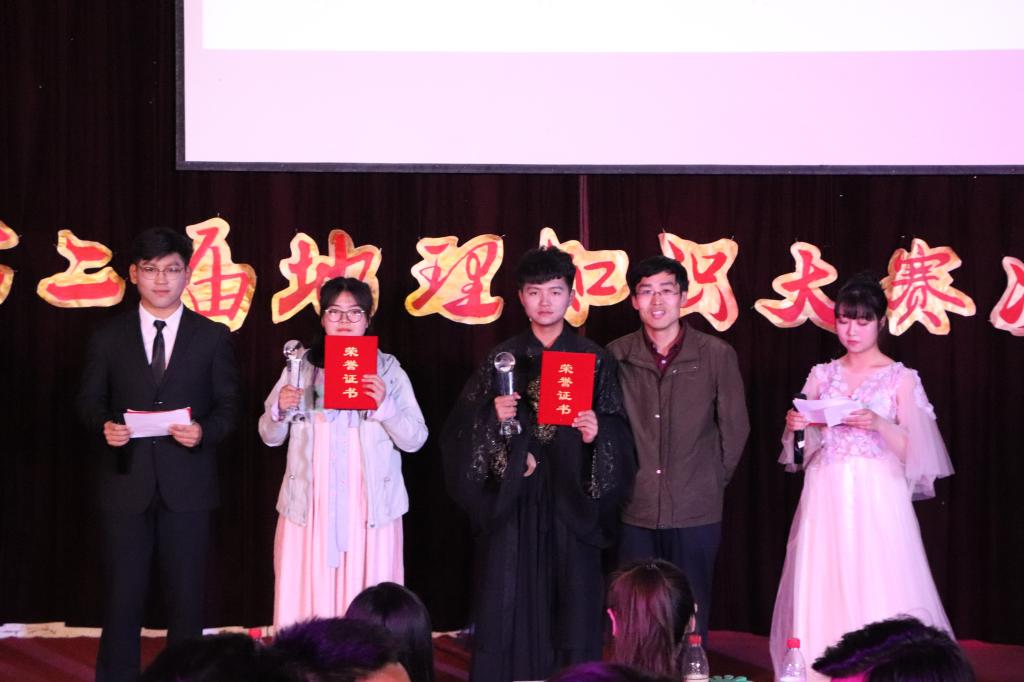 经过初赛、复赛的重重选拔,来自英国365集团、文学院、历史与社会发展学院等学院的8位同学成功进入决赛。在优美古典的开场舞《大鱼》结束后,本次比赛正式拉开帷幕,比赛共分为“曲水流觞”、“分曹射覆”和“琵琶新弹”三个环节。首先进行的是第一、二环节,主要考察选手们的地理知识储备,他们仔细审题,快速思考,应答如流,充分展现了自己不俗的地理素养,赢来满堂喝彩。与此同时,刘琳老师、程钰老师对题目以及视频中出现的相关地理知识进行严谨而生动的讲解,其中程钰老师由侵蚀地貌引出喀斯特地貌,用风趣幽默的语言向同学们详细介绍了喀斯特地貌的形成原理和过程。紧接着,由院十大歌手何宇彤和王若强带来的歌曲《不染》深情动人,引起在场观众的阵阵欢呼。接下来的“琵琶新弹”环节更可谓精妙绝伦,选手们就自己所熟悉的地理知识围绕“习山水之理 扬尚学之风”的主题采用丰富多彩的形式进行展示。其中,歌曲表演《将进酒》、《离骚》分别呈现了嵩山、楚地等地区的独特地理韵味;《春夜喜雨》使用诗歌朗诵与PPT讲解相结合的方式,将春雨的朦胧与美丽诠释的淋漓尽致;地理版《青花瓷》更是古色古香,带给观众眼前一亮的感觉。在随后进行的你画我猜互动环节中,主持人邀请评委和观众上台进行游戏互动,将现场气氛推向高潮。最终,经过三个环节的激烈比拼,王鹏、穆亚楠荣获一等奖,刘刚、董善博和王曦荣获二等奖,王冬枝、王琪和刘昕荣获三等奖,其中,穆亚楠荣获最佳人气奖。