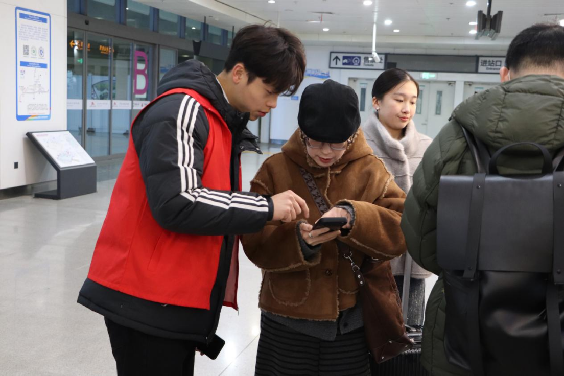 在济南西站东出站口,学院志愿者们设立了“返济志愿服务点”,主动关注过往学子,为携带大件行李的同学及时搭把手,提拿行李,减少旅途奔波。针对部分学生对济南地铁不熟悉的情况,志愿者们在地铁入口和自助售票机旁协助查询线路、指导购票,帮助大家顺利出行。此外,志愿者们还简明介绍了济南市及槐荫区的人才政策与就业信息获取渠道,为返济学子提供实用的发展资讯,搭建起服务人才的连心桥。