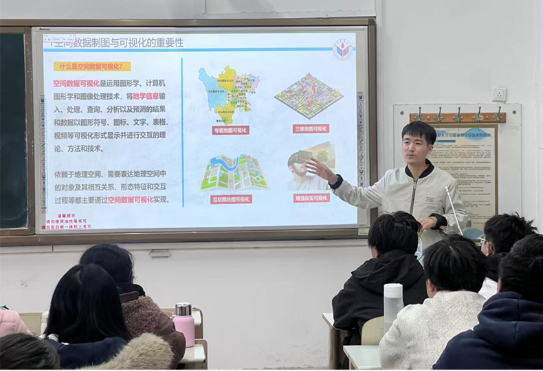 本次公开课活动分为课堂展示和课后研讨两个环节。在课堂展示环节,徐夕博老师围绕空间数据制图与可视化展开教学,深入讲解了空间数据的概念、分类和形式,系统梳理了空间数据制图的主要类型(重点剖析离散的空间数据和连续的空间数据的可视化表达方式)和相关工具软件,同时详细阐述空间数据制图与可视化过程中视觉变量选择策略,比如大小、方向、颜色和透视等视觉变量。此外,徐夕博老师还结合温度、降水和高程等空间数据制图与可视化的实例,强调在空间数据制图过程中要做好地理数据安全保护工作,引发学生对地理信息数据安全与国家安全之间的辩证思考。徐夕博老师的讲解不仅搭建了从地图编绘基础理论到实际生活的桥梁,有效激发了同学们对空间数据可视化的学习兴趣,更通过对空间数据制图及可视化的严谨逻辑、地图符号的规范要求,以及地理空间数据安全的现实关联,培养了同学们严谨的科研态度与理论联系实践的能力,使同学们受益匪浅。