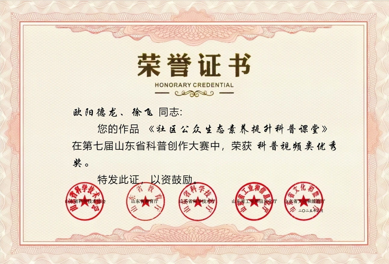近日,第七届山东省科普创作大赛获奖作品名单公布,我院欧阳德龙、徐飞两位老师的参赛作品《社会公众生态素养提升科普课堂》荣获科普视频类优秀奖。