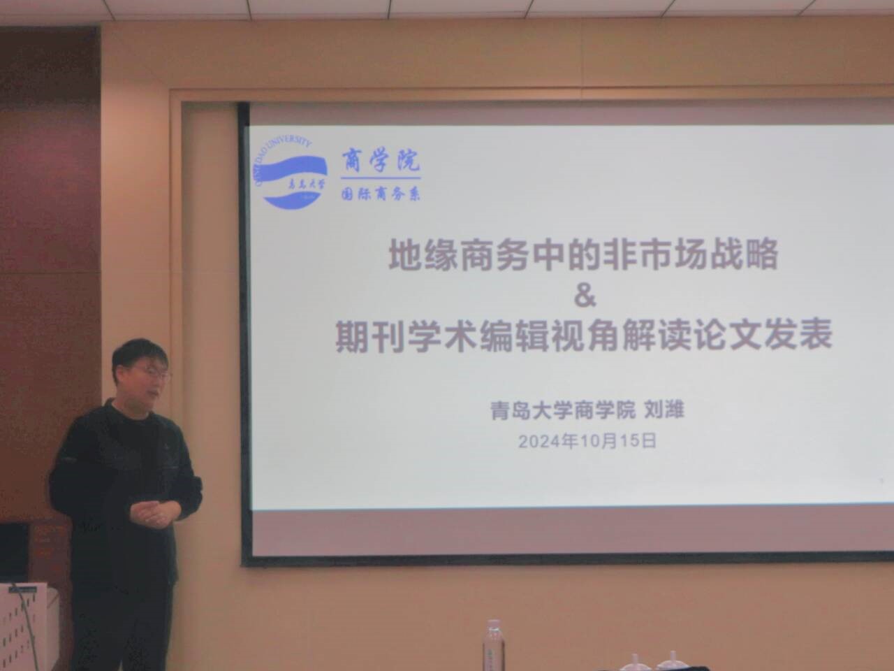 2024年10月15日,青岛大学商学院刘潍教授应邀来我院交流访问,并于长清湖校区文澜楼G210报告厅做了题为“地缘商务中的非市场战略研究与期刊学术编辑视角解读论文发表”的学术报告。报告由英国365集团李连刚副教授主持,学院近100余名师生参加。