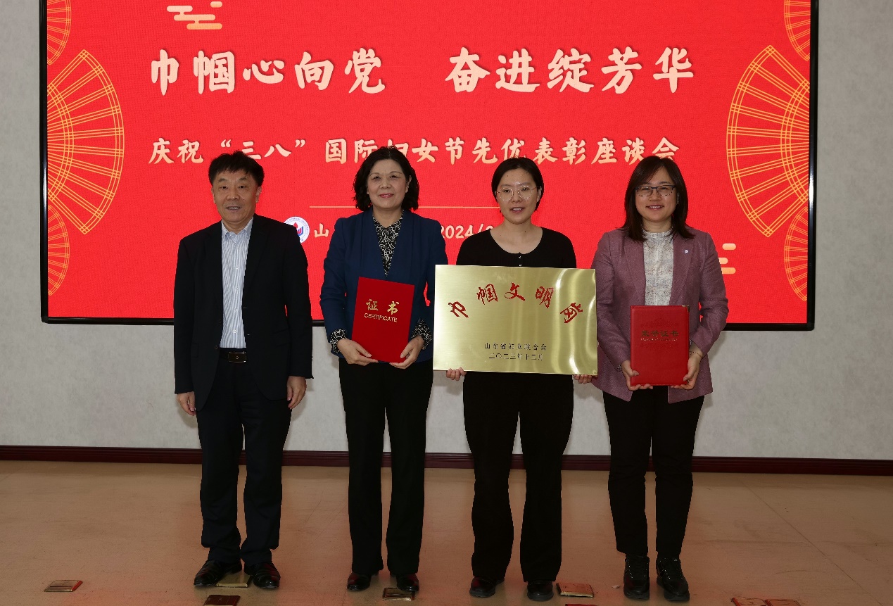 为庆祝“三八”国际妇女节,深入贯彻落实习近平总书记关于妇女儿童和妇联工作重要论述精神,表彰在新时代征程上信念坚定、对党忠诚、实事求是、担当作为的优秀女教职工先进集体和个人,3月6日上午,学校召开庆祝“三八”国际妇女节先优表彰座谈会,学校党委副书记万光侠出席会议并为获奖代表颁奖。我院韩美教授喜获“山东省三八红旗手”荣誉称号,并作为获奖代表交流发言。