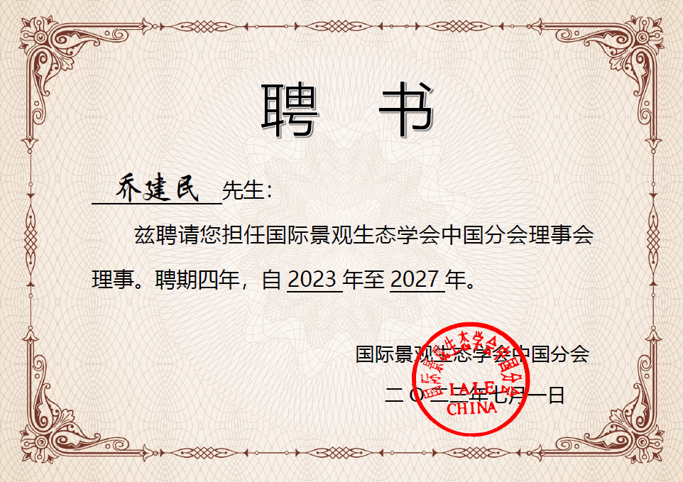 图2 国际景观生态学会中国分会(IALE-China)聘书