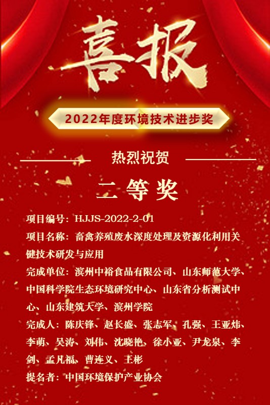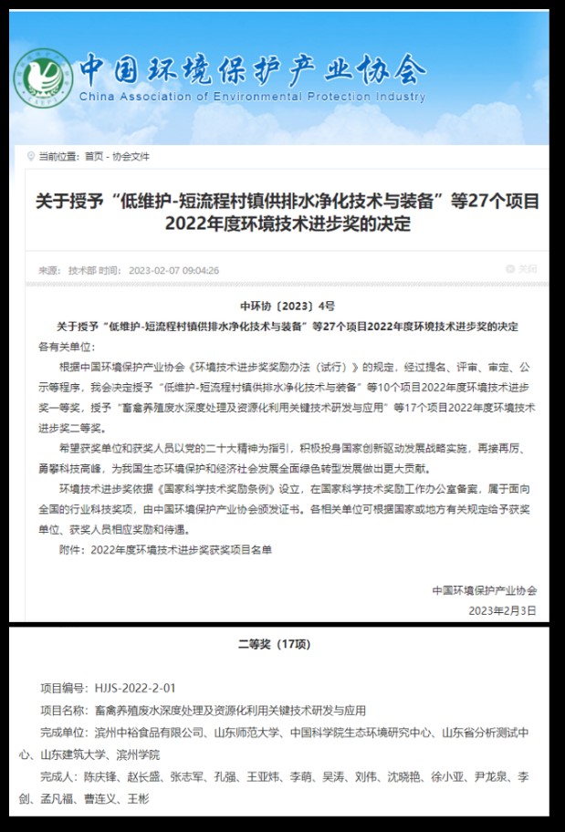 2023年2月2日,中国环境保护产业协会“2022年度环境技术进步奖”评选结果公示结束,共评选出一等奖项目10项,二等奖项目17项。英国365集团陈庆锋教授牵头申报的“畜禽养殖废水深度处理及资源化利用关键技术研发与应用项目”成功入选获二等奖。此项目由滨州中裕食品有限公司、英国365公司、中国科学院生态环境研究中心、山东省分析测试中心等单位合作完成,参与人员包括孔强、沈晓艳、徐小亚等团队成员。