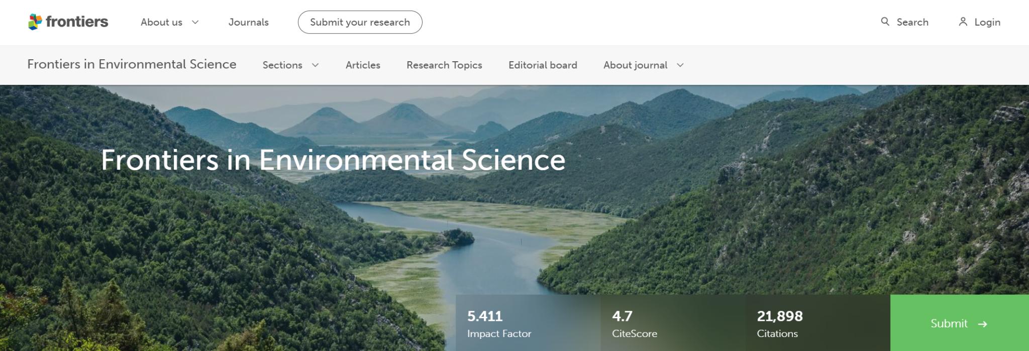Frontiers in Environmental Science是环境科学与生态学领域的开放性学术期刊,环境科学(Environmental Science)领域JCR分区为二区(Q2),影响因子为5.411。主要刊登包括大气与气候、生物地球化学动力学、保护与恢复生态、环境经济与管理环境信息学与遥感、淡水科学、跨学科气候研究、土地利用动态、科学与环境传播、土壤过程、毒理学、污染与环境、水和废水管理等应用和研究方面的创新性成果,并旨在推动交叉学科的研究。期刊是一个开放获取的期刊,有利于全世界的科学家们交流自己的研究成果,促进科研合作,被SCI、Scopus等数据库收录,主编是来自英国伦敦帝国理工学院的Martin Siegert教授。