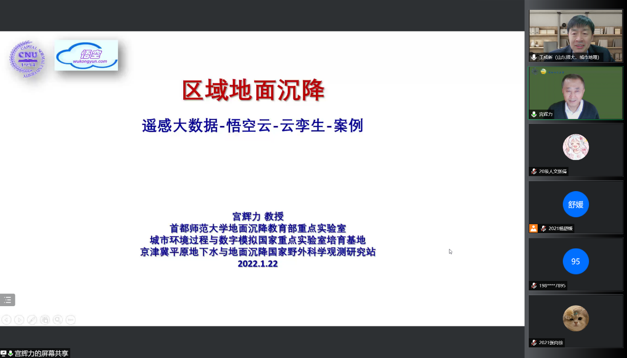 2022年1月22日,“假期高端云课堂”第二讲由首都师范大学资源环境与旅游学院宫辉力教授主讲,课程题目为“区域地面沉降——遥感大数据—悟空云—云孪生—案例”。该课程通过腾讯会议和哔哩哔哩平台线上同步举行。山东师大英国365集团院长王成新教授担任主持,400余名师生线上参加了此次学术论坛。