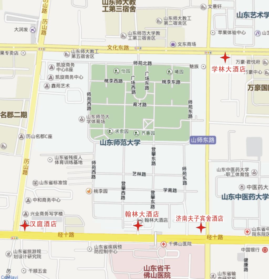 (2)由济南西站(高铁站)至翰林大酒店(约18公里),乘坐K911、202路公交车,在“经十路山师东路”站下车,穿过街天桥,步行50米至翰林大酒店;或乘坐出租车,费用约为50元。
