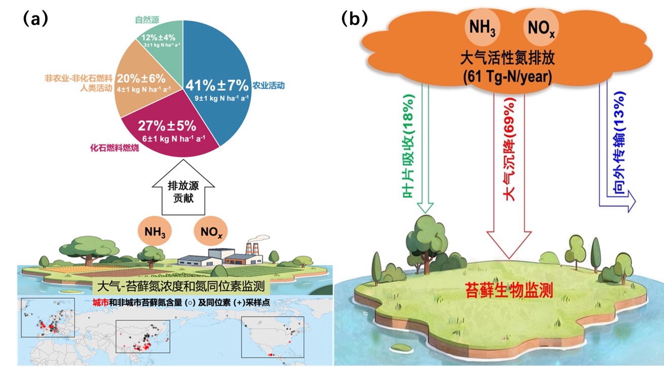 他们构建了苔藓氮含量和氮同位素定量约束铵、硝态氮沉降通量的方法。结合区域活性氮排放总量、植物叶片对气态氨和氮氧化物的吸收速率、植被面积,估算了植物吸收和向区外传输占总氮排放的比例。结果显示,三个污染区的大气沉降、叶片吸收、向外传输平均占排放总量的69%、18%、13%,这对于掌握大气氮污染效应的过程途径以及大气氮传输的影响提供了有用的科学依据,成果以封面论文于《Global Change Biology》2026年第32卷第1期正式发表(图1b)。
