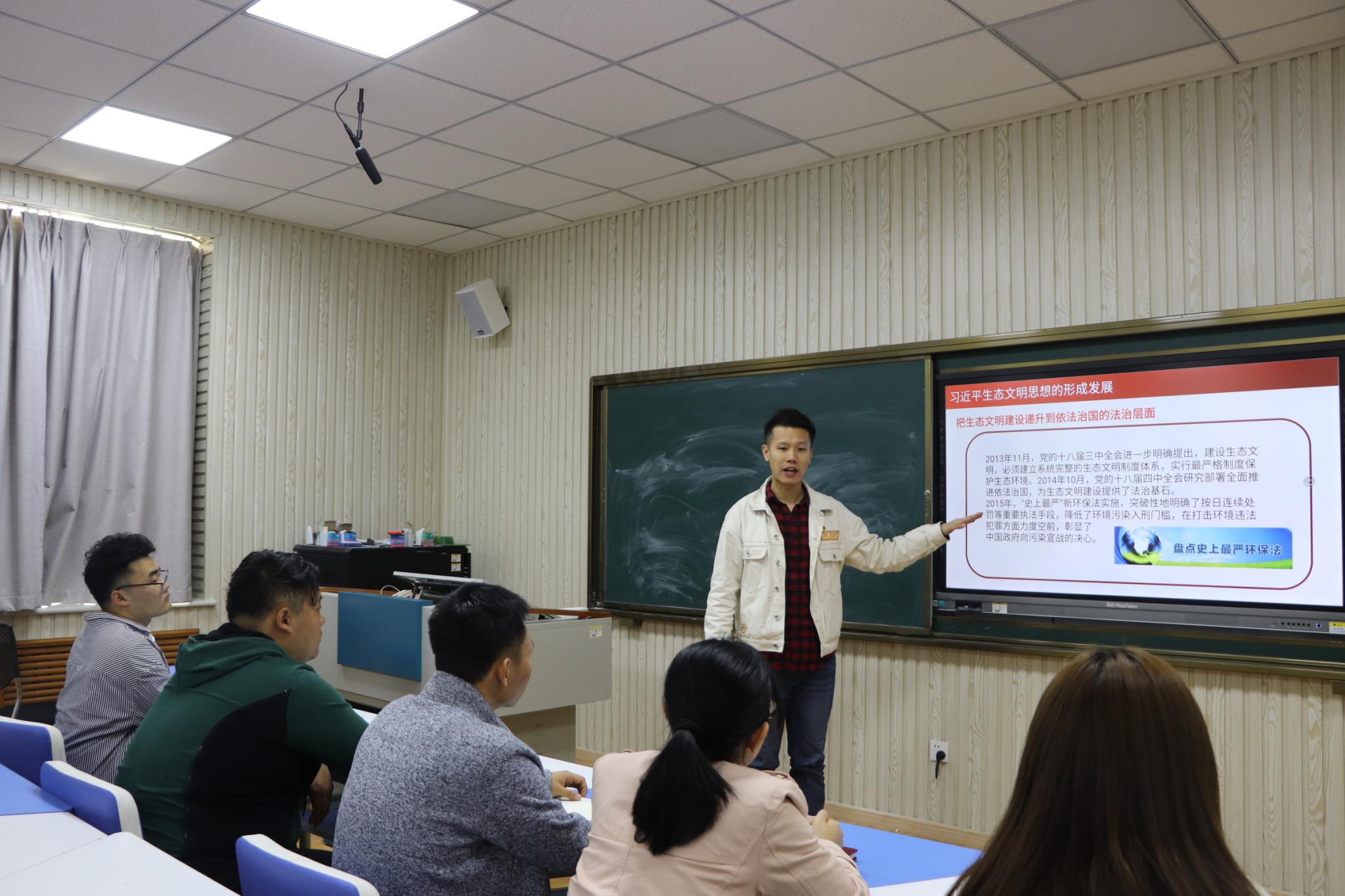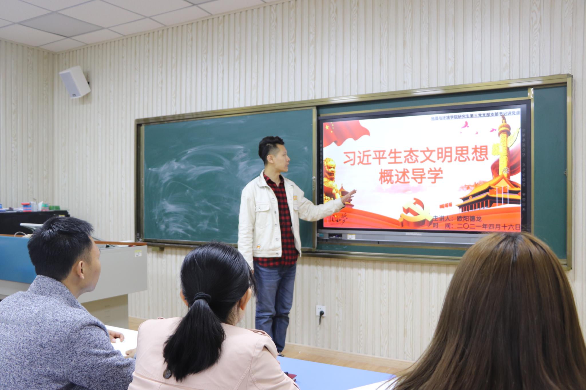为不断推动党史学习教育持续走深走实,结合贯彻落实学史明理、学史增信、学史崇德、学史力行,学党史、悟思想、办实事、开新局的任务要求,学院研究生第三党支部于4月16日在文澜楼G324会议室开展了“习近平生态文明思想概述导学”的主题党课,支部书记欧阳德龙担任主讲人,支部全体党员共同参与了本次学习。
