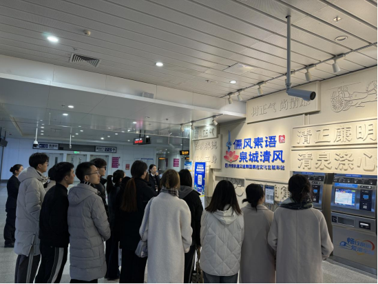 随后,大家乘地铁前往廉政文化主题车站。在廉政文化主题车站,学生党员们参观了多个展区,并在地铁站答题机进行了关于廉政文化的答题,拓展了知识面。深入了解了廉洁文化的历史背景、典型案例和现代意义。通过丰富的展品和生动的讲解,大家对廉洁文化有了更深刻的认识。在廉政文化主题车站,学生党员们积极参与了展馆的互动项目,如廉洁知识问答等。这些互动环节不仅增加了活动的趣味性,还进一步强化了大家对廉洁文化的理解和记忆。