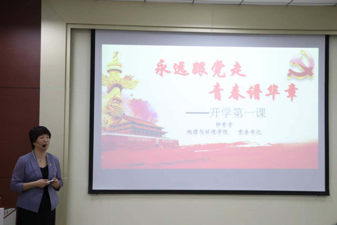 9月9日下午,学院党委书记钟秀芳在长清湖校区文澜楼A座G210为学生讲授秋季学期“开学第一课”,辅导员老师刘相良主持,地理本2001班和地卓班的同学参加了活动。
