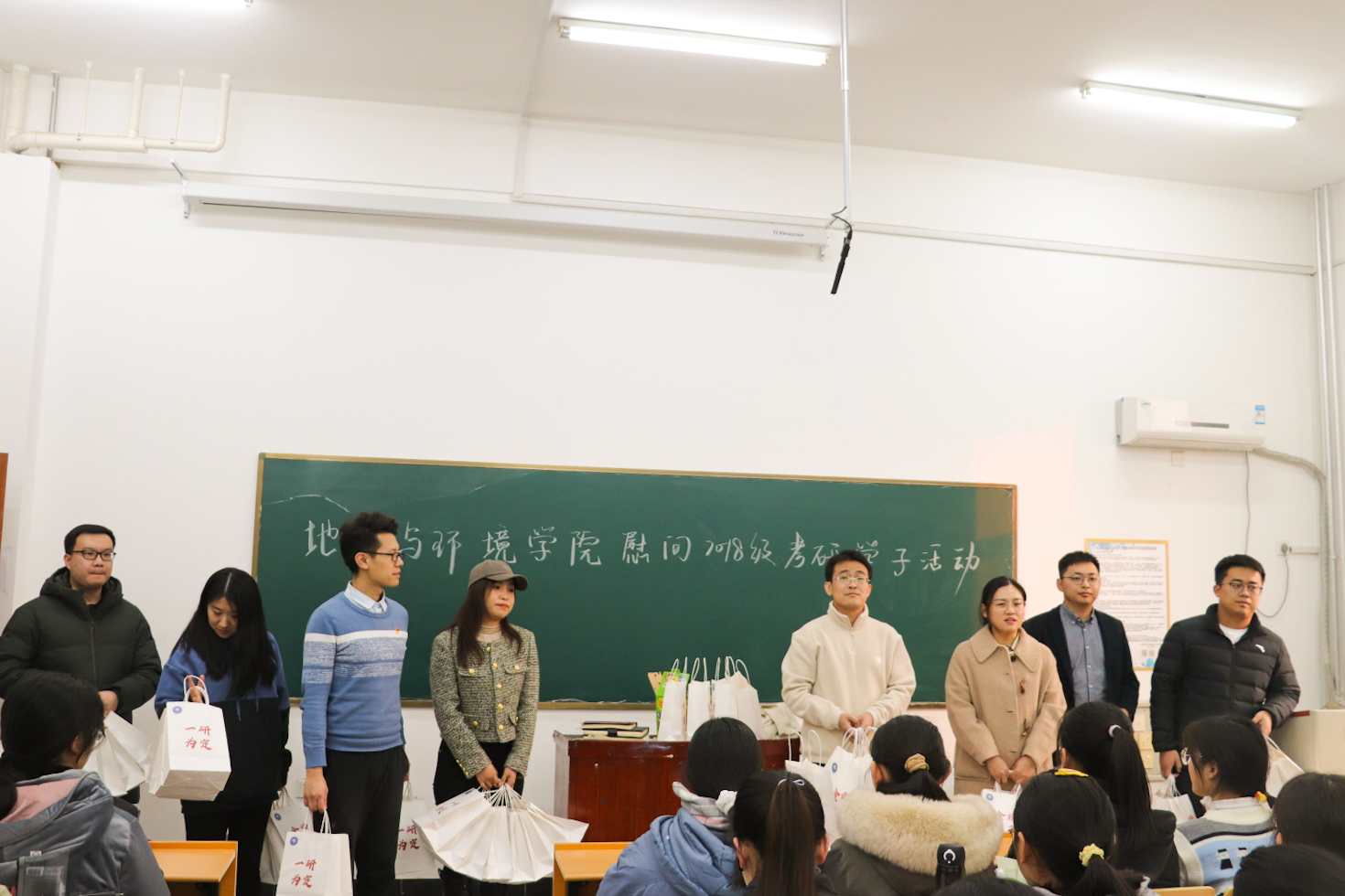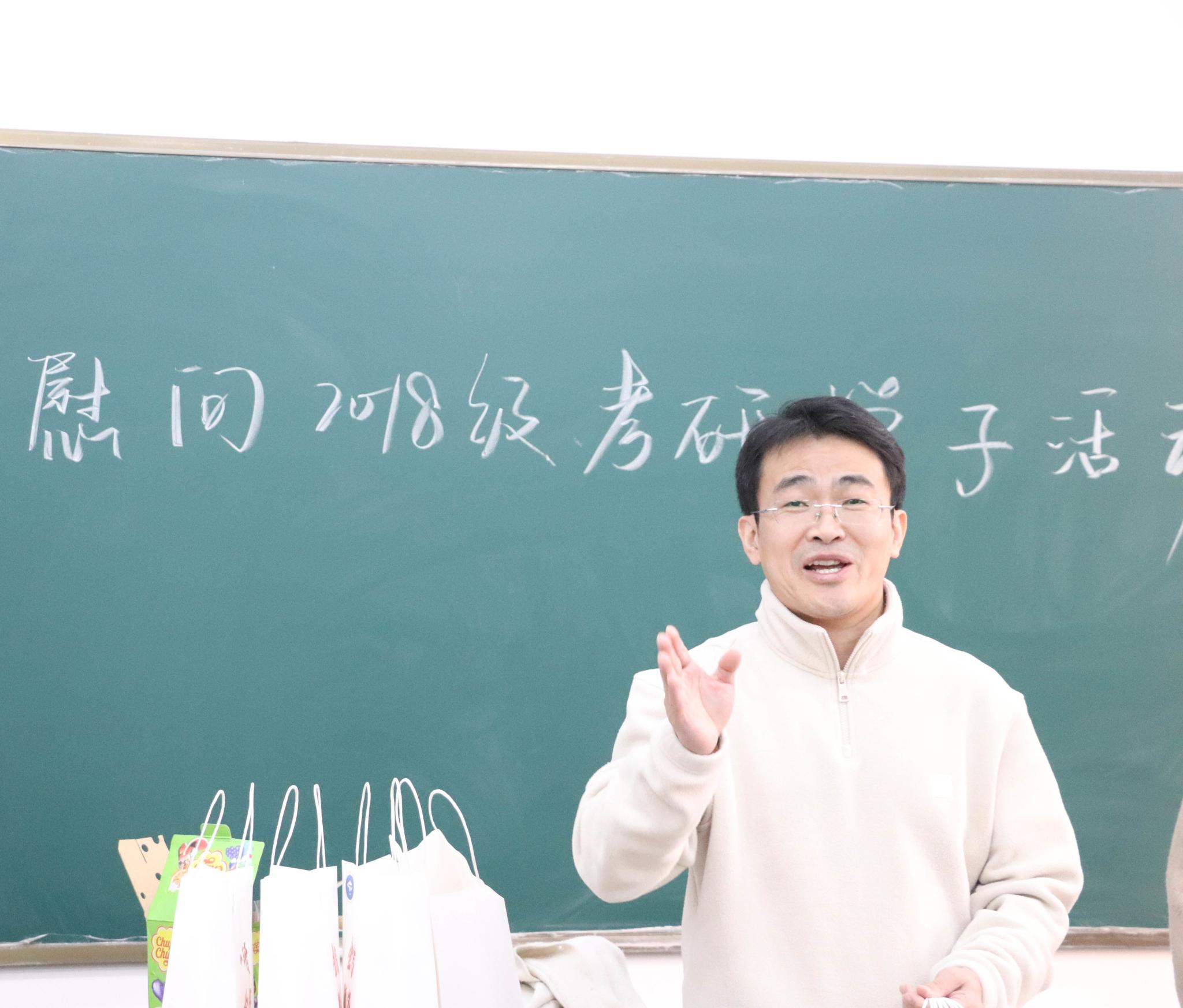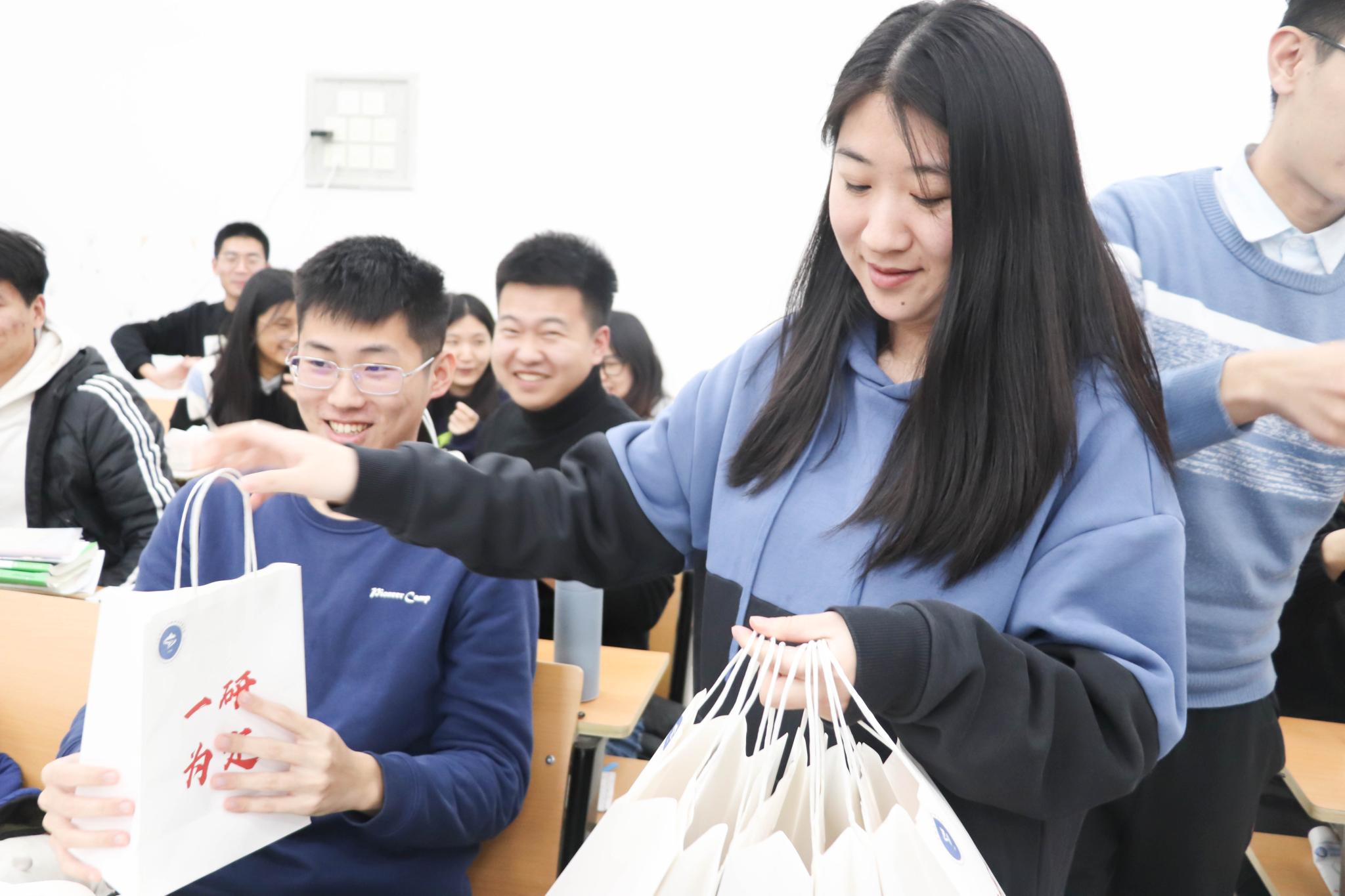 李山峰向备考学子表达了殷切的希望,鼓励考生一是要坚定理想、持之以恒,在复习过程中,树立必胜的信心;二是要合理规划、有序备考,调整好复习备考的心态,制订好小目标;三是要加强锻炼、劳逸结合,健康的身体和积极的心态是奋斗的根基。毕业生辅导员陶艺和欧阳德龙,分别就省教育厅对于疫情常态化管控下考生考试要求以及备考冲刺阶段饮食作息注意事项等问题,向同学们做出了温馨提示。随后各位老师为同学们发放了写有考研祝福的“福袋”并向每位考生送上了真挚的祝福。