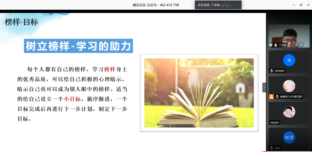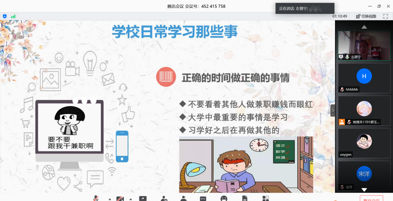 会议伊始,丁杰伟从学习方法、考试经验、科研经历、自身管理四个方面阐述了他的“学习之道”,在交流的过程中,他着重强调了以“榜样”作为精神航标和动力来源的重要性,同时,他也指出对待学习要实事求是、善于交流,切不可不懂装懂、闭门造车。左晋宁从生活中的点滴小事展开,分享了她的学习方法。她认为学习态度和用心程度决定了一个人最终能否取得既定目标的成功,建议大家为自己寻找学习的目标,以此持续鞭策激励自己前行。接下来,赵云璐着重分享了心态调整方面的经验,告诉大家在学习的过程中要注重劳逸结合。最后,崔俊以思维导图的形式与大家分享了面对消极情绪的应对措施和解决办法。