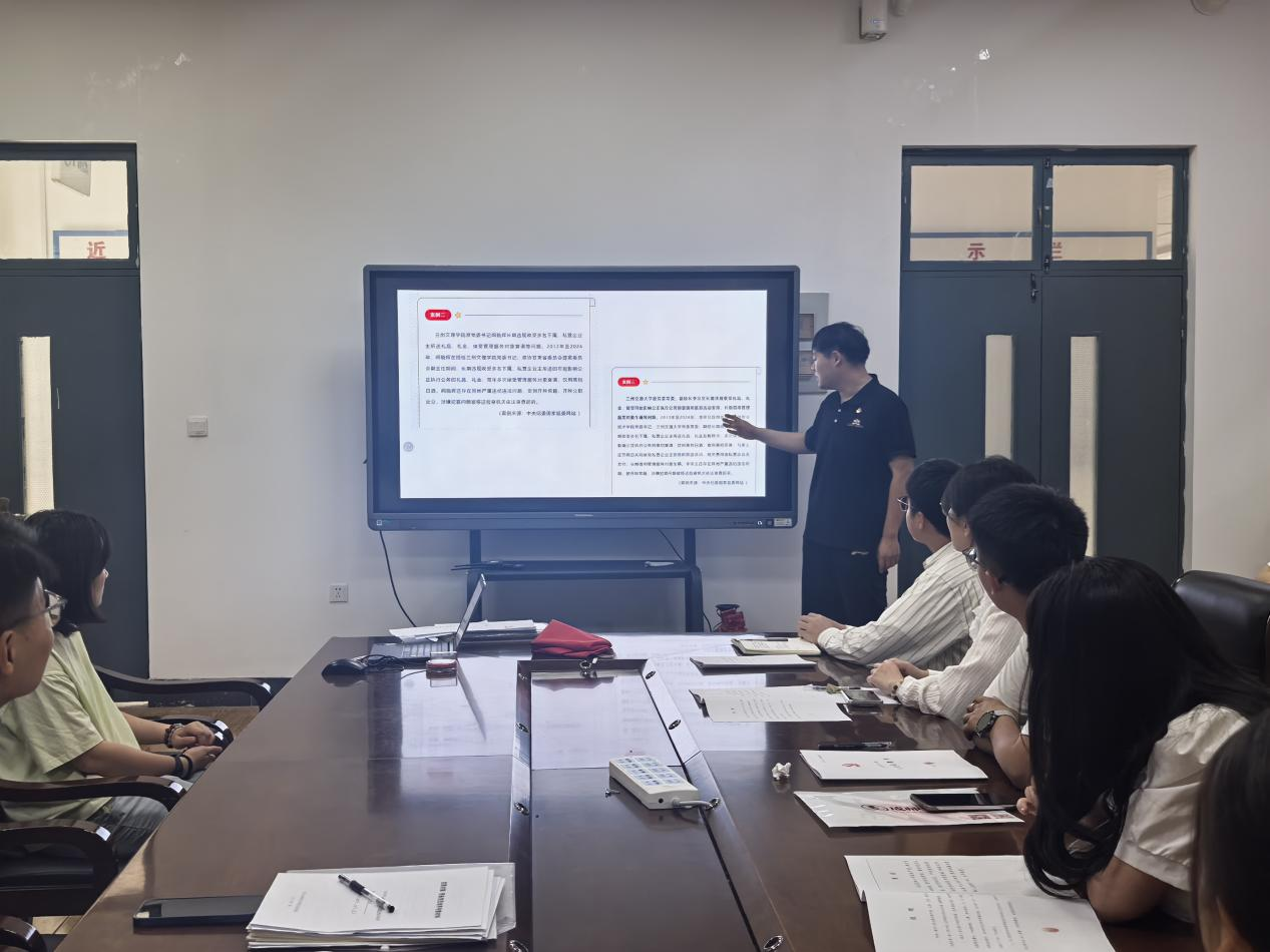 针对研究生第四党支部作为师范类高校教育硕士支部的实际特点,亓广志重点分享了近年来教育系统中违反中央八项规定精神的典型案例,并配合警示教育视频进行深入剖析。“以案为鉴,以案促改”,使党员们深刻认识到廉洁自律不仅是党性的重要体现,更是新时代教育工作者应具备的基本素养。