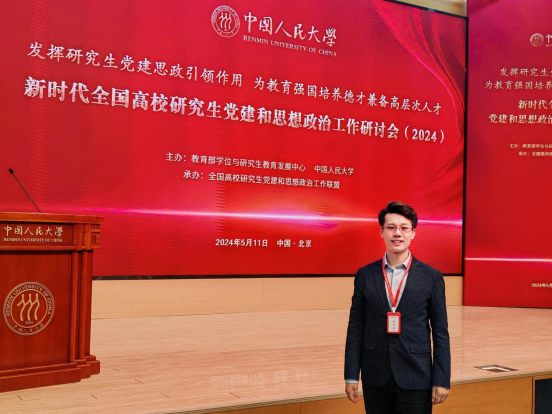 5月11日,新时代全国高校研究生党建和思想政治工作研讨会(2024)在中国人民大学召开。本次会议以“发挥研究生党建思政引领作用,为教育强国培养德才兼备高层次人才”为主题,由教育部学位与研究生教育发展中心和中国人民大学共同主办,全国高校研究生党建和思想政治工作联盟承办。学校研究生院负责同志受邀参加会议,我院研究生第三党支部书记欧阳德龙代表第三批全国高校“百个研究生样板党支部”创建单位参加了会议。