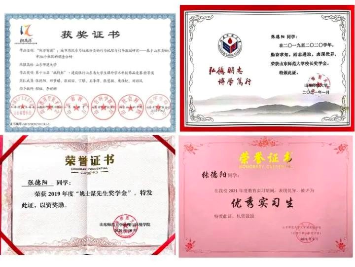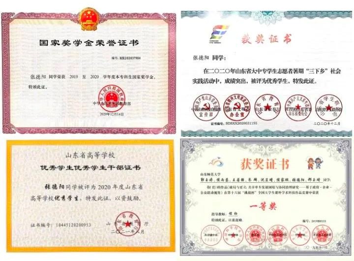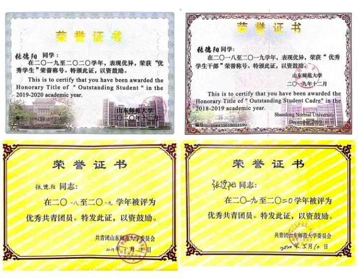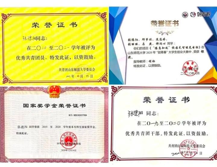 获山东省优秀学生称号,2020-2021学年“十佳学生干部”、连续三年获得校级优秀学生、优秀学生干部、优秀团员、优秀团干部称号。