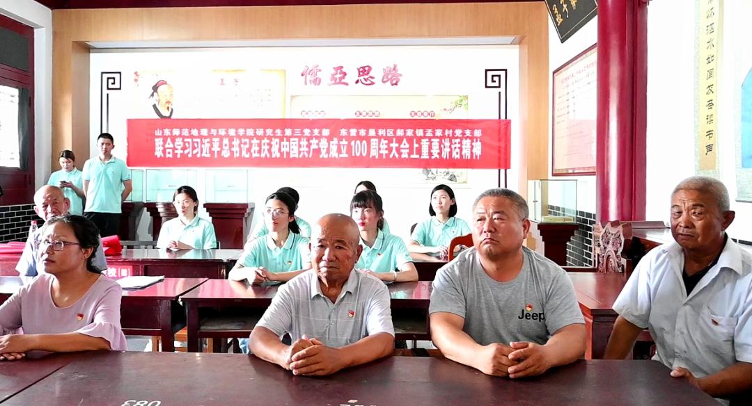 同时,为进一步贯彻落实中共山东省委教育工委《关于印发<高校党支部建设规范提升工作方案>的通知》要求,将党史学习教育与支部内涵式建设进一步紧密结合,7月15日研究生第三党支部与东营市垦利区郝家镇孟家村党支部开展“联合学习习近平总书记在庆祝中国共产党成立100周年大会上重要讲话精神”主题党日活动,通过学习讲话原文、观看大会转播以及心得交流,将伟大的“建党精神”进一步入心入脑。实践队员韩诗表示,“通过本次暑期社会实践,我们将党史宣讲与党史学习有机结合起来,发扬红色传统,传承红色基因,赓续共产党人的精神血脉,在学思践悟中进一步、深层次汲取党史中的智慧与力量!”