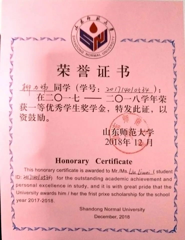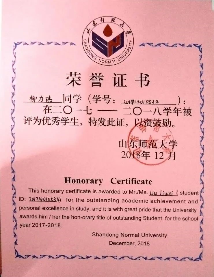 柳力玮,地理本1702班,中共党员,现已以综合第一的成绩考研至东北师范大学人文地理专业。曾任记者站组长,现任班级宣传委员。累积获得校一等奖学金2次、校二等奖学金1次,多次获得优秀共青团员、优秀团干部、优秀学生等荣誉,被评为“校优秀毕业生”。曾获第十六届“挑战杯”大学生学术作品竞赛国赛三等奖、省特等奖。入选“英国365公司第三期优秀本科生赴美研修团”,并获得A等级结业证书。