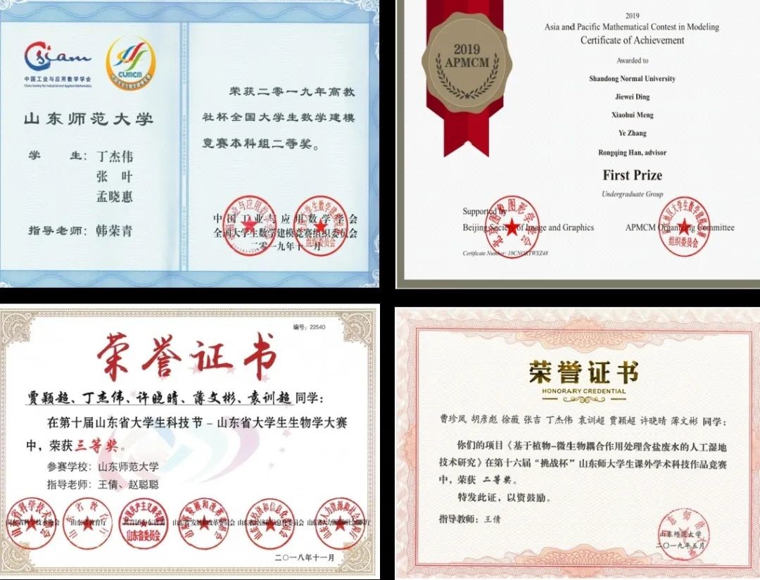2020年9月参与实用新型专利《一种人工湿地智能装置》一项。高教社杯全国大学生数学建模竞赛本科组国家级二等奖、亚太地区大学生数学建模竞赛(APMCM)本科组一等奖、2018年11月山东省大学生生物学大赛省三等奖。
