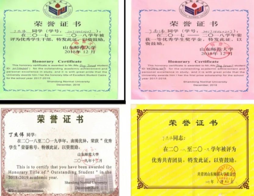 获2020年度国家奖学金、2019年度山东省优秀学生称号,连续三年获校一等优秀学生奖学金、多次获优秀学生干部、优秀学生、优秀共青团员、优秀共青团干部称号。