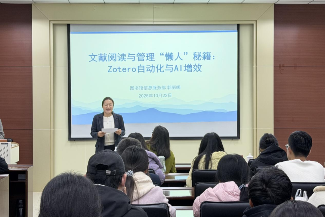 活动中,郭丽娜以《文献阅读与管理“懒人”秘籍:Zotero自动化与AI增效》为题展开分享。她结合自身在信息素养教育领域的丰富经验,系统讲解了Zotero文献管理软件的核心功能与进阶技巧,内容涵盖软件安装与界面介绍、题录的多种收集方式、文献分类与标签管理、笔记与注释整合、引文自动插入与样式编辑、多端同步设置,以及常用插件的配置与使用。