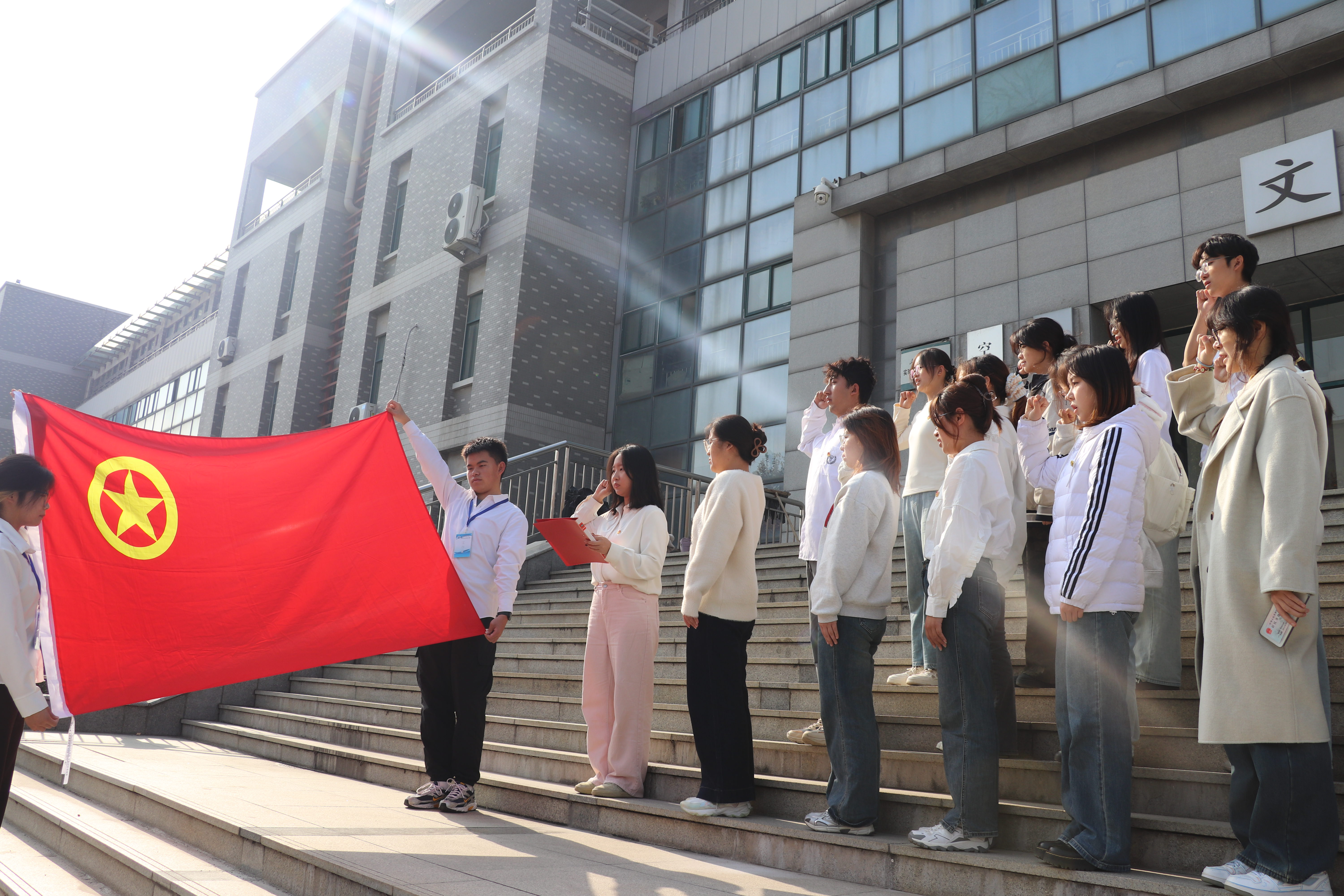 仪式现场转移至文澜楼A区楼前,优秀团员代表魏雨婷带领全体新团员庄严宣誓。铿锵有力的誓言回荡在校园中,充分展现了新时代团员青年的责任与担当。随后,《中国共产主义青年团团歌》激昂奏响,本次入团仪式在歌声中圆满落幕。