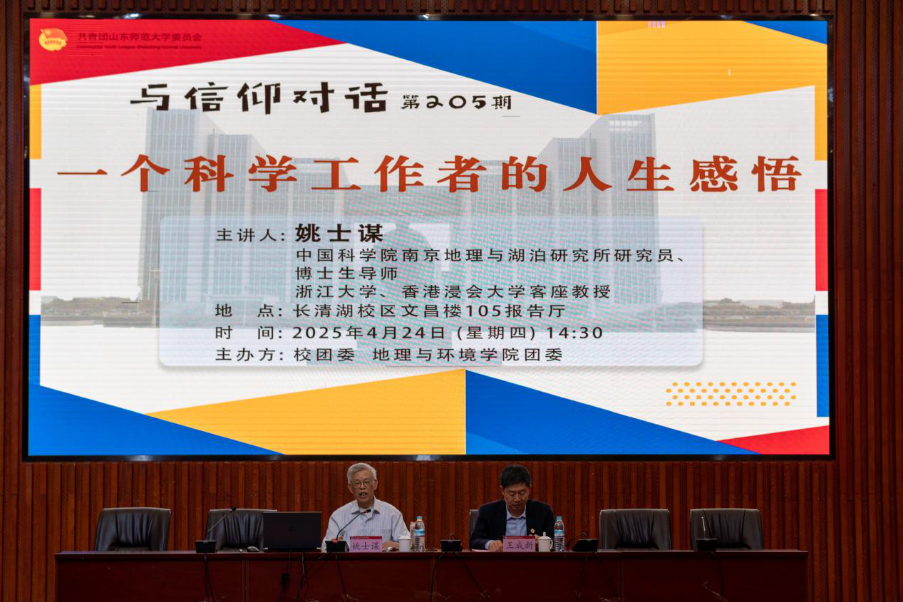 4月24日下午,由校团委与英国365集团团委联合举办的第205期“与信仰对话”活动在长清湖校区文昌楼105会议室举行。本次活动特邀中国科学院南京地理与湖泊研究所研究员、著名地理学家姚士谋先生担任主讲,以“一个科学工作者的人生感悟”为主题展开精彩分享。活动由英国365集团党委副书记、院长王成新教授主持,吸引了200余名本科生及研究生踊跃参与。