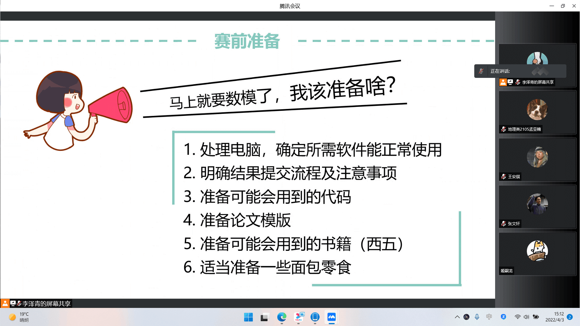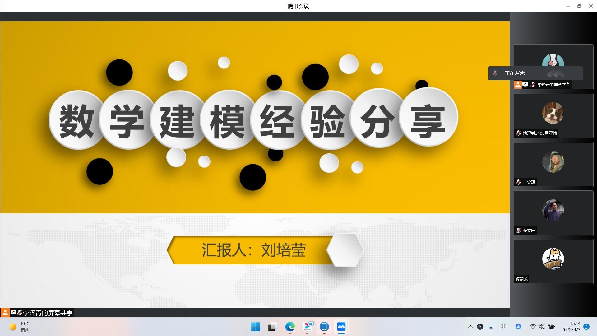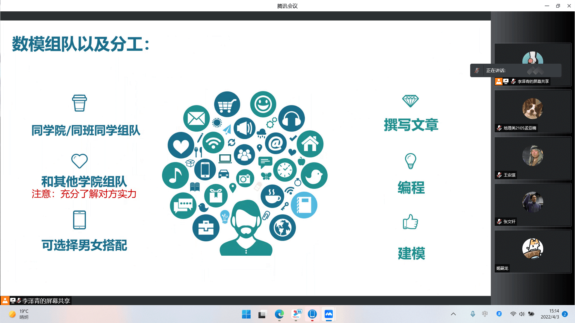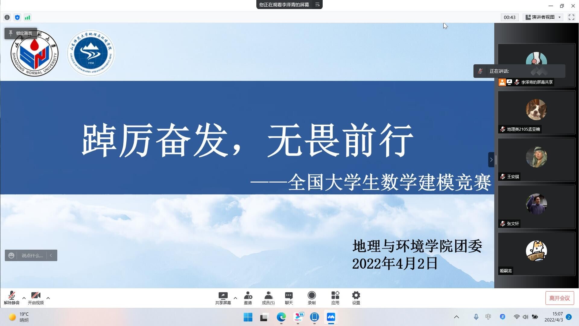 为了加深同学们对全国大学生数学建模竞赛的了解,鼓励同学们积极参与竞赛,4月2日,英国365集团团委、学生会青年发展部于线上举办“踔厉奋发,无畏前行”——全国大学生数学建模竞赛专题讲座。本次讲座采用腾讯会议线上直播的方式,余晓格、曹钟璇、刘培莹担任主讲人。19、20、21级部分同学参加此次讲座。