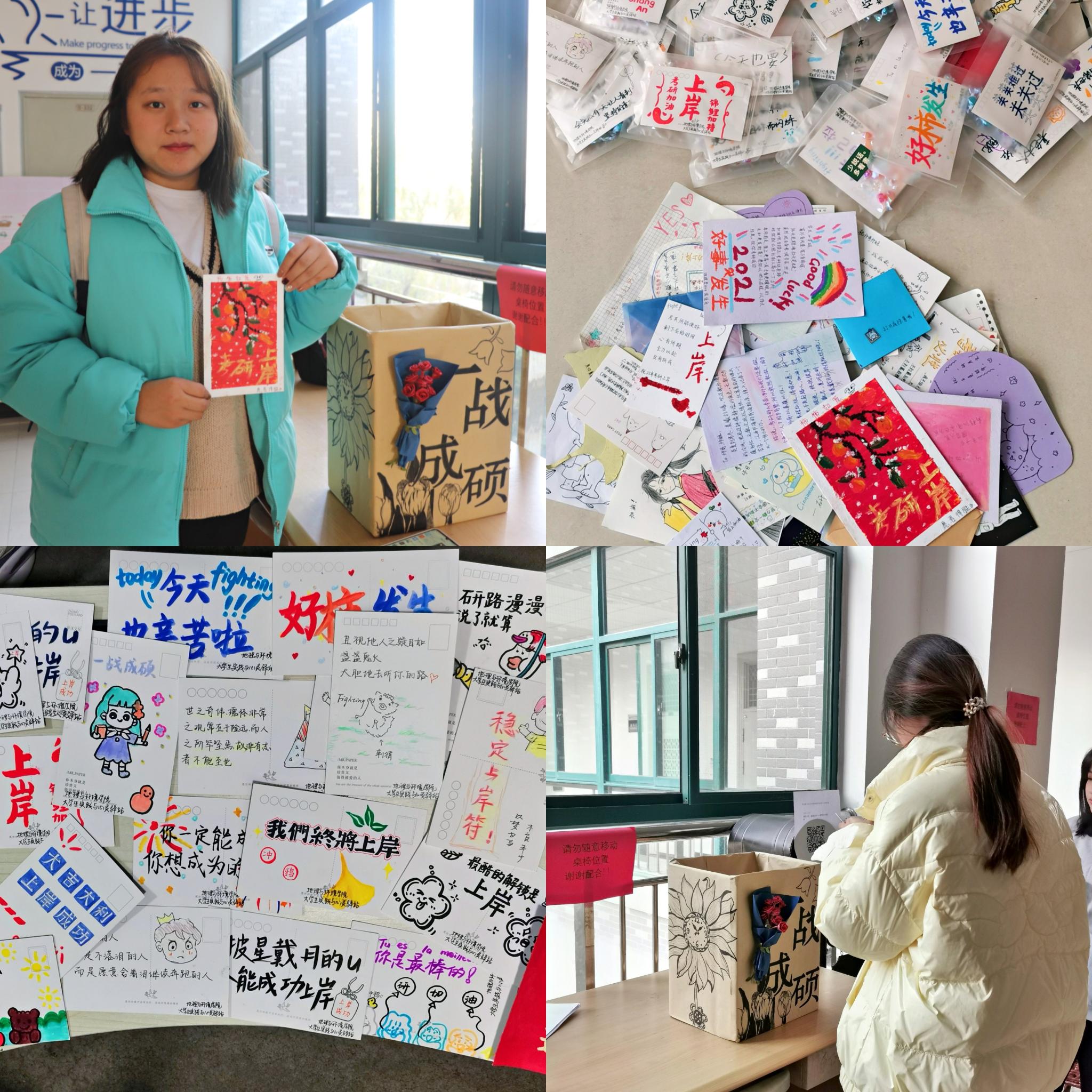 活动前期,大学生实践与心灵驿站社团对于具体活动内容进行了详细讨论,最终敲定了本次活动的具体安排。组织部负责编写策划书和活动人员的组织工作;宣传部负责制作卡片收集箱、撰写活动通知,并号召各班级组织委员转发宣传;秘书部负责填写活动登记表、完成后期德育分、报销等流程。“微微卡片,温暖心灵”活动分为线上通知和线下收送卡片两个部分。线上,大学生实践与心灵驿站号召各班组织委员将社团通知转发到班级群当中,呼吁同学们积极参与;线下,大学生实践与心灵驿站安排社团骨干去指定地点值班收卡片,将卡片送到考研同学们的手中。社团骨干们手写的100张卡片和198名同学参与制作的精美卡片与糖果包装在一起,在文渊楼C区二至四楼送出。备战考研的同学们十分感动,与社团骨干们合影留念。在社团骨干和热心同学的共同努力下,本次活动圆满成功。