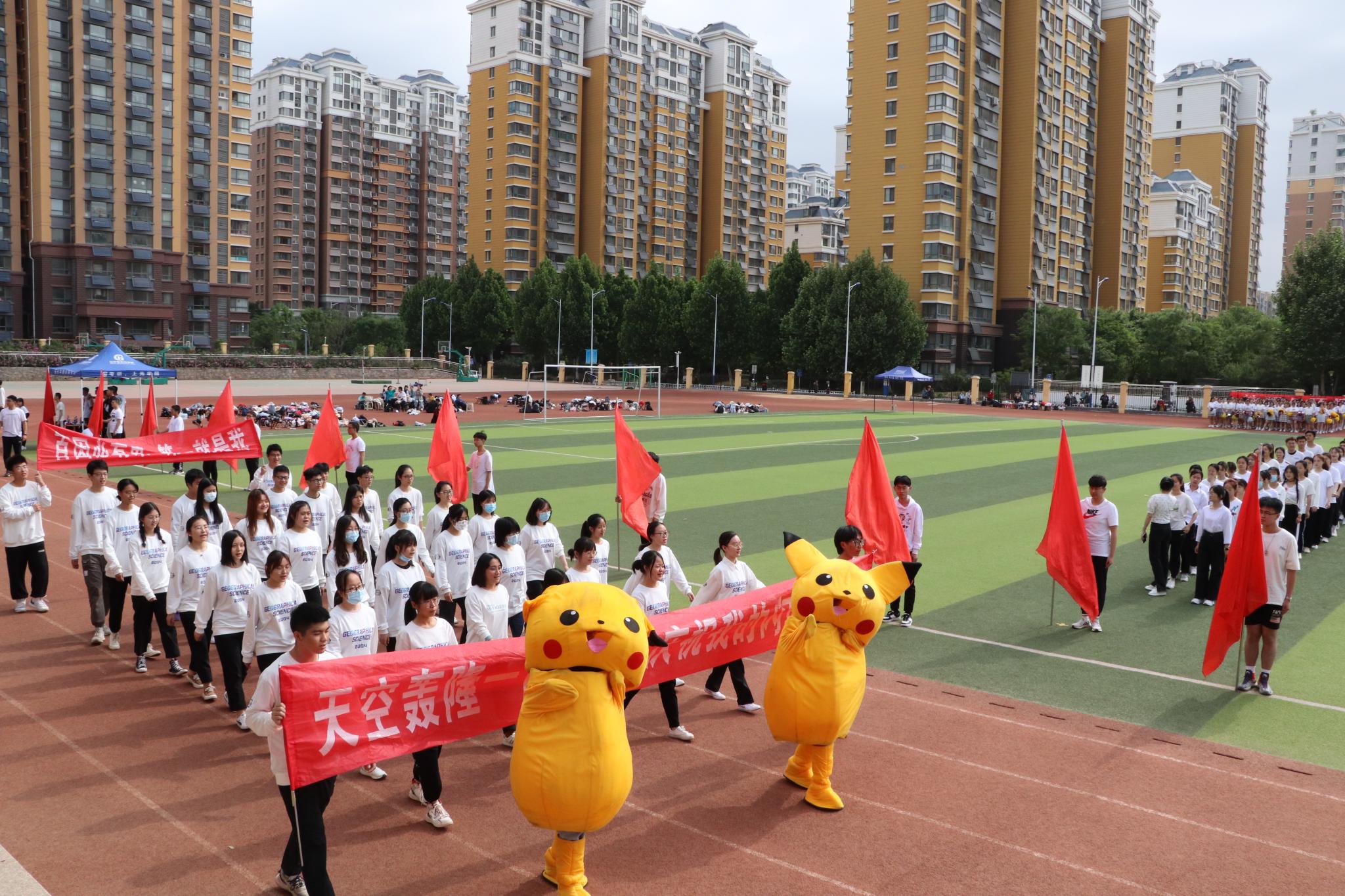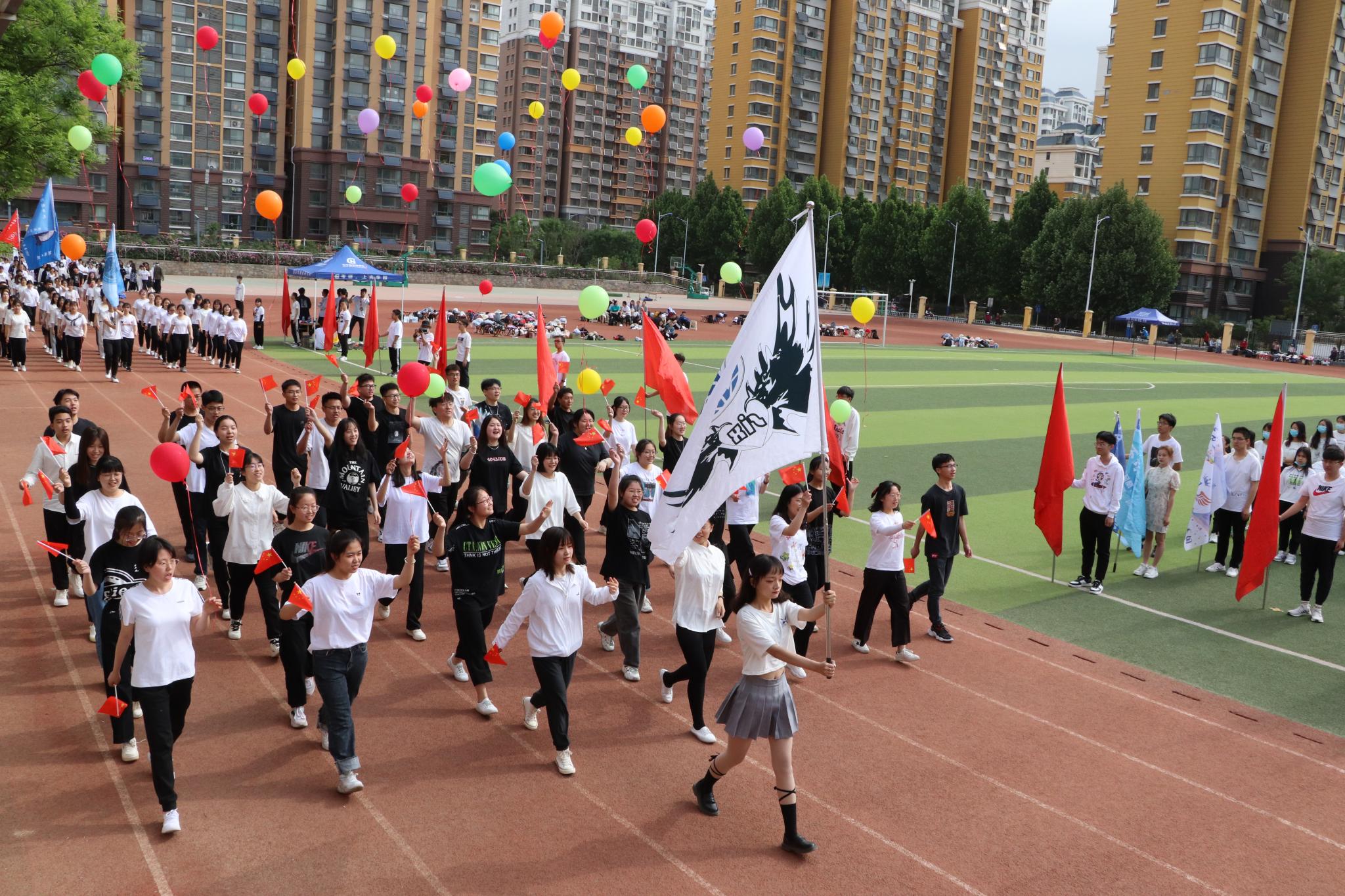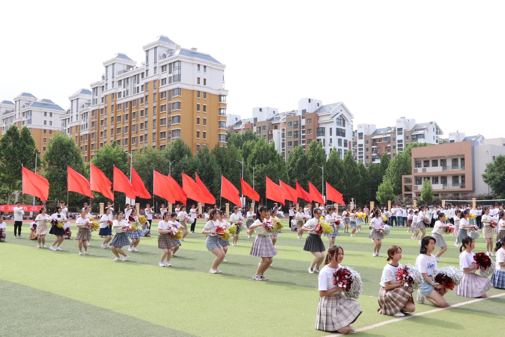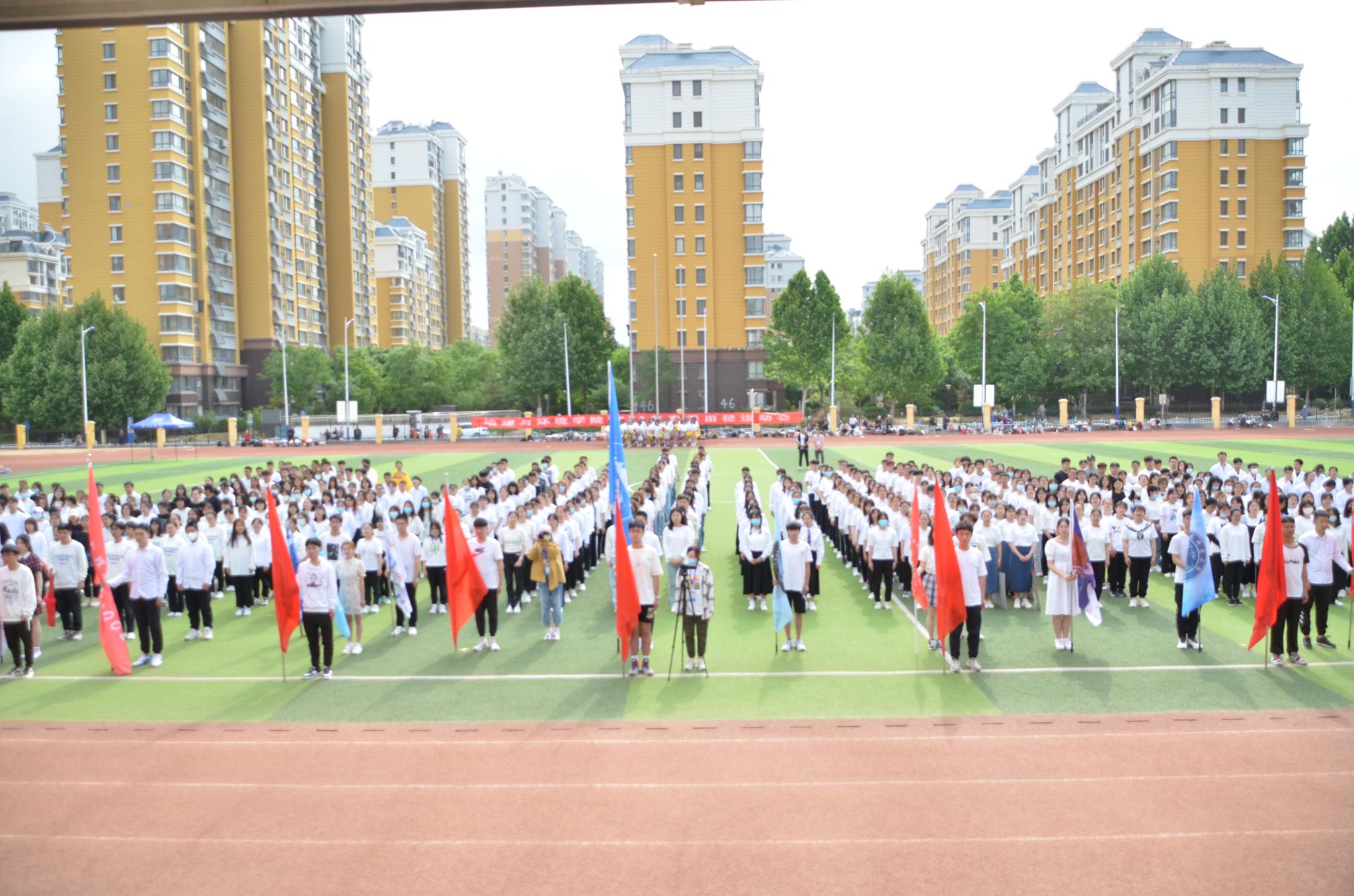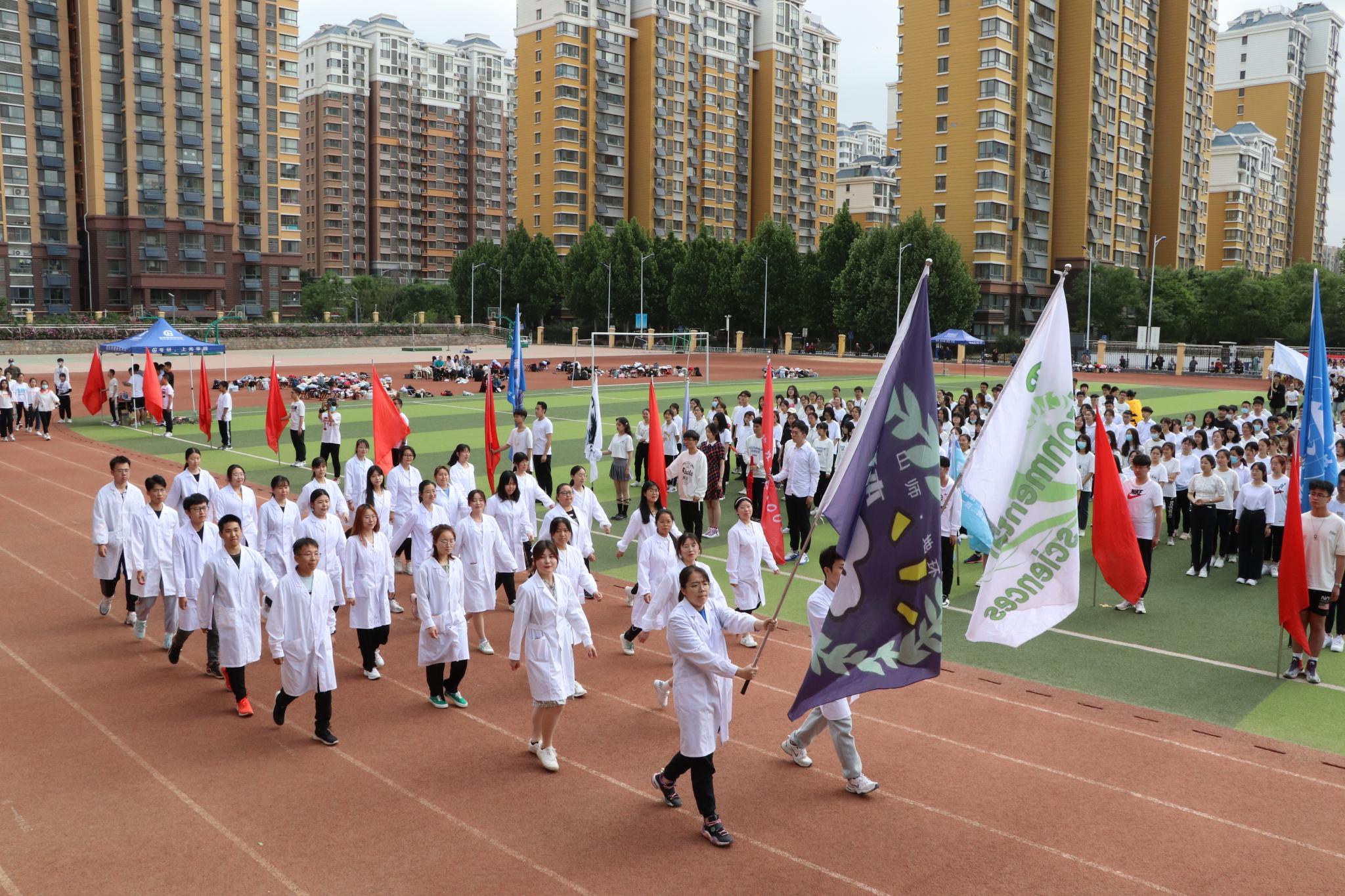 上午八点半,五星红旗伴随着《义勇军进行曲》缓缓升起,全场师生齐唱起国歌,气氛热烈而庄重,随后运动会开幕式由学院党委副书记李山峰主持;学院党委副书记、院长王成新教授致开幕词,他在致辞中提到,思想进步、学术科研、健康生活都离不开强健的体魄,“更高、更快、更强”的体育运动精神,与党史学习教育一样,有着“强信仰、勇担当”的实际意义,希望全体运动员们都能遵守比赛规则、尊重对手、赛出风采、再创佳绩;在党委书记钟秀芳宣布开幕式正式开始后,伴随着激昂的《运动员进行曲》,红旗方队、裁判员代表队以及各班级方队踏着坚定的步伐依次入场,百人啦啦操的表演为整个运动场营造了更为浓郁的活力氛围。
