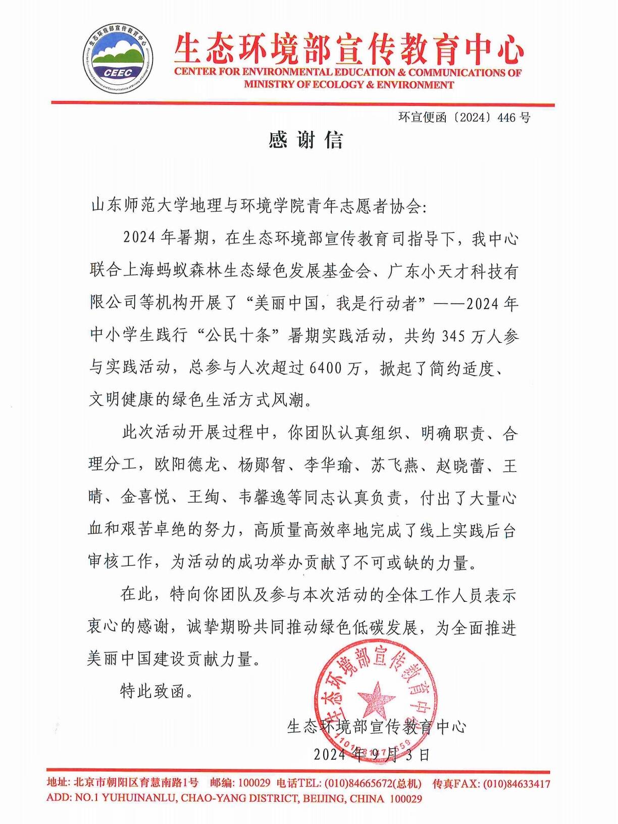 近日,生态环境部宣传教育中心向我院青年志愿者协会发来感谢信,感谢其为2024年中小学生践行“公民十条”暑期实践活动线上实践后台审核工作及生态环境宣传教育工作的大力支持,并对团队成员表示诚挚谢意。