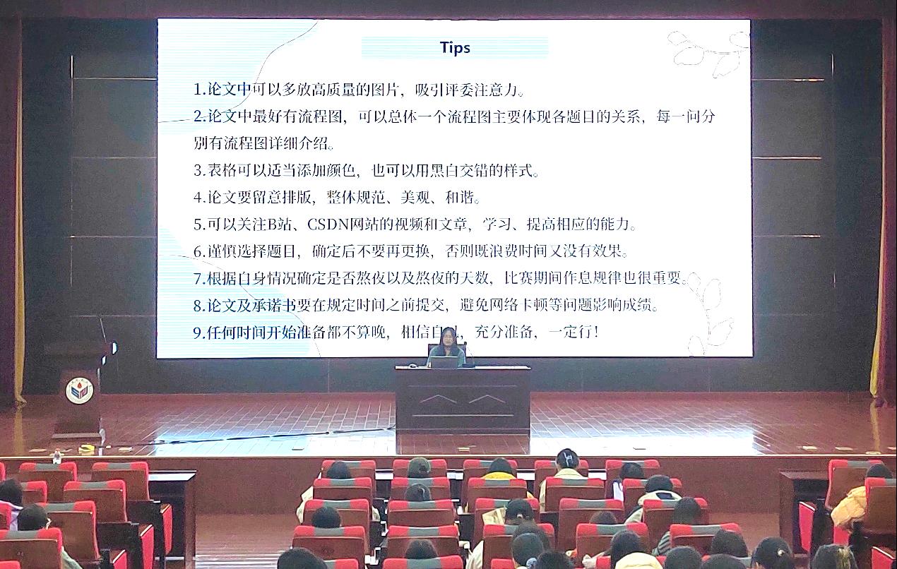 讲座伊始,金珊从比赛简介,赛前准备,比赛须知,心得体会四个方面进行了汇报。在前期准备方面,从组队分工到资料获取与心态调整都给出了切身建议,并分别推荐了从编程到建模需要的工具软件。比赛须知方面,为具体流程安排给出切实的建议,并强调了高质量图片的积极作用。金珊告诉同学们“数模竞赛在任何时间准备都不算晚,付出终会有回报!”令同学们印象深刻,她给出温馨叮嘱和提示,从自身体会出发,让同学们对数学建模比赛有了更充分的认识。