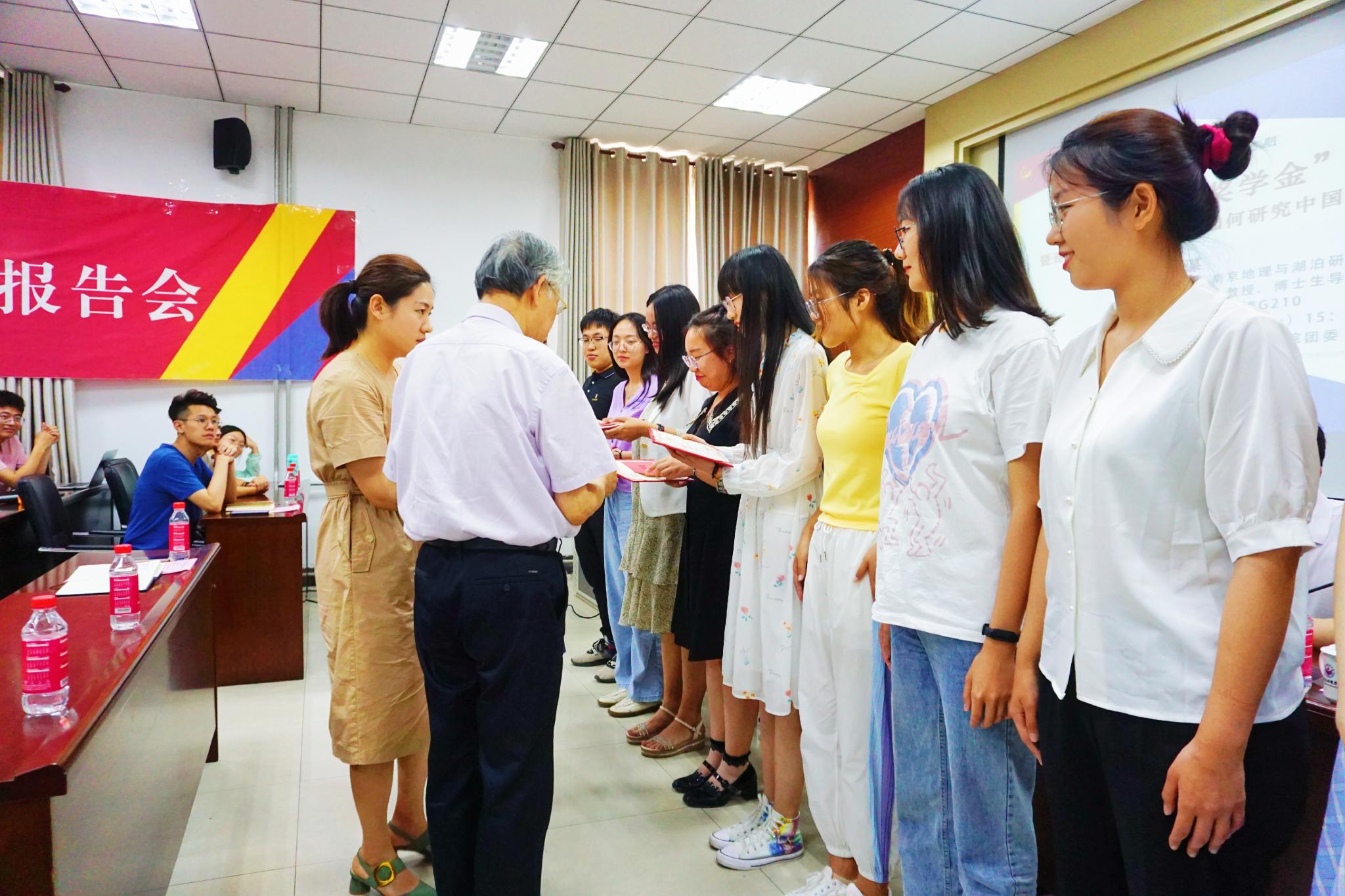 颁奖典礼上,李山峰宣读了获奖同学名单,姚士谋为获奖同学颁发了证书与奖学金,他勉励同学们要感恩学院培养、珍惜青春时光,赶乘地理学发展的时代契机,昂首展牛劲,学好扎实本领,未来为地理学的进一步发展贡献青春才智;钟秀芳对获奖同学表达了祝贺,她指出,姚士谋先生数十年躬耕于教学科研一线,退休后仍关注我国高等教育事业,在多所学校设立了“姚士谋先生奖学金”以激励更多的青年专注学习、科研,为国家和民族多做贡献,希望获奖同学可以坚持终身学习、坚持全面发展,以终为始、拾级而上,成为更好的自己。2019级地理科学专业王泽萍作为获奖学生代表发言,她向姚士谋先生表示了衷心的感谢,也代表获奖学子表态未来将继续努力、奋勇向前、创造更大的成绩。