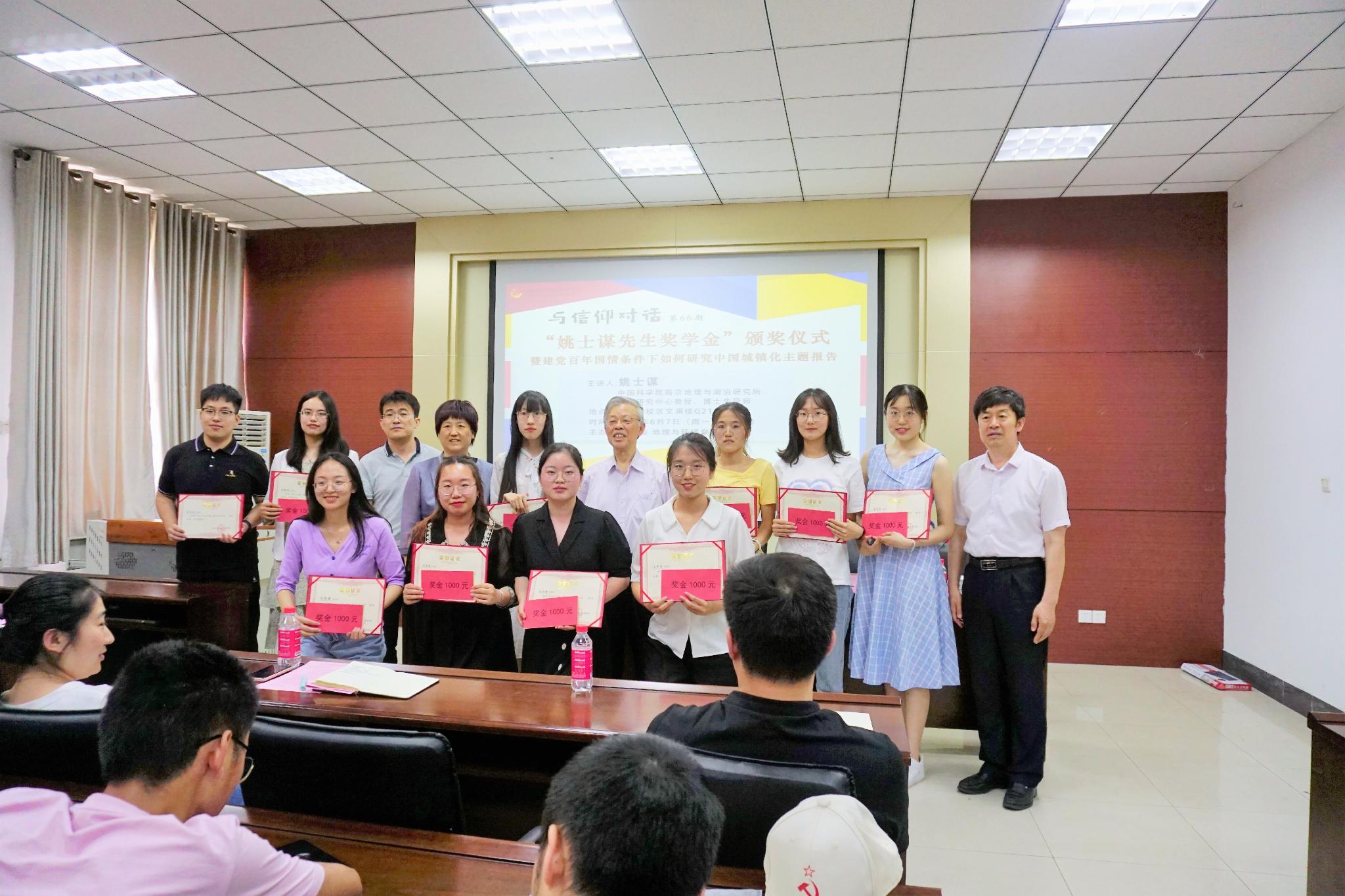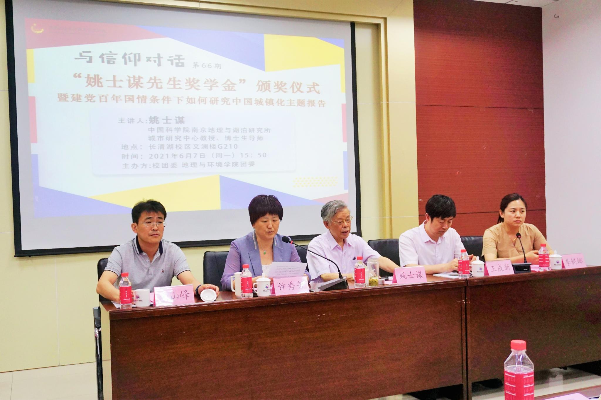 6月7日下午,学院于长清湖校区文澜楼A座G210教室举行“姚士谋先生奖学金”颁奖典礼暨“与信仰对话”报告会。中国科学院南京地理与湖泊研究所博士生导师姚士谋教授,学院党委书记钟秀芳,党委副书记、院长王成新教授,党委副书记李山峰,团委书记、学工办主任李妮娜及学院部分辅导员出席了此次活动。典礼由李妮娜主持、报告会由王成新主持。