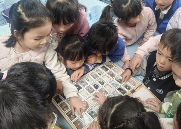 在活动的最后环节,科普团队带来了120多种矿物标本供孩子们观察。孩子们围在展示桌前,充满好奇地查看各式各样的矿石,不时发出惊叹与提问,亲手触摸、仔细观察这些来自地球深处的“宝藏”,在实践中进一步加深了对矿物岩石的认识。