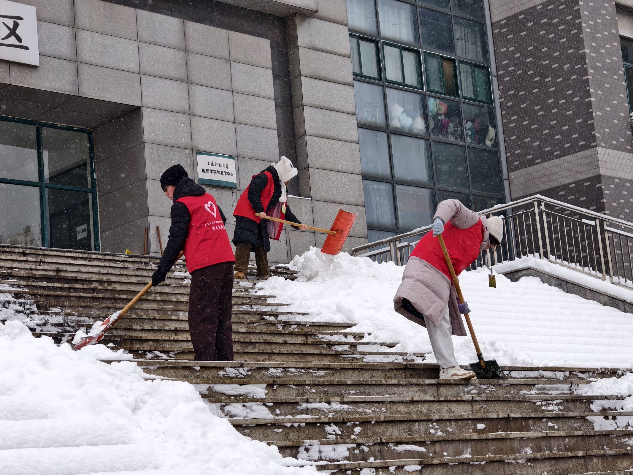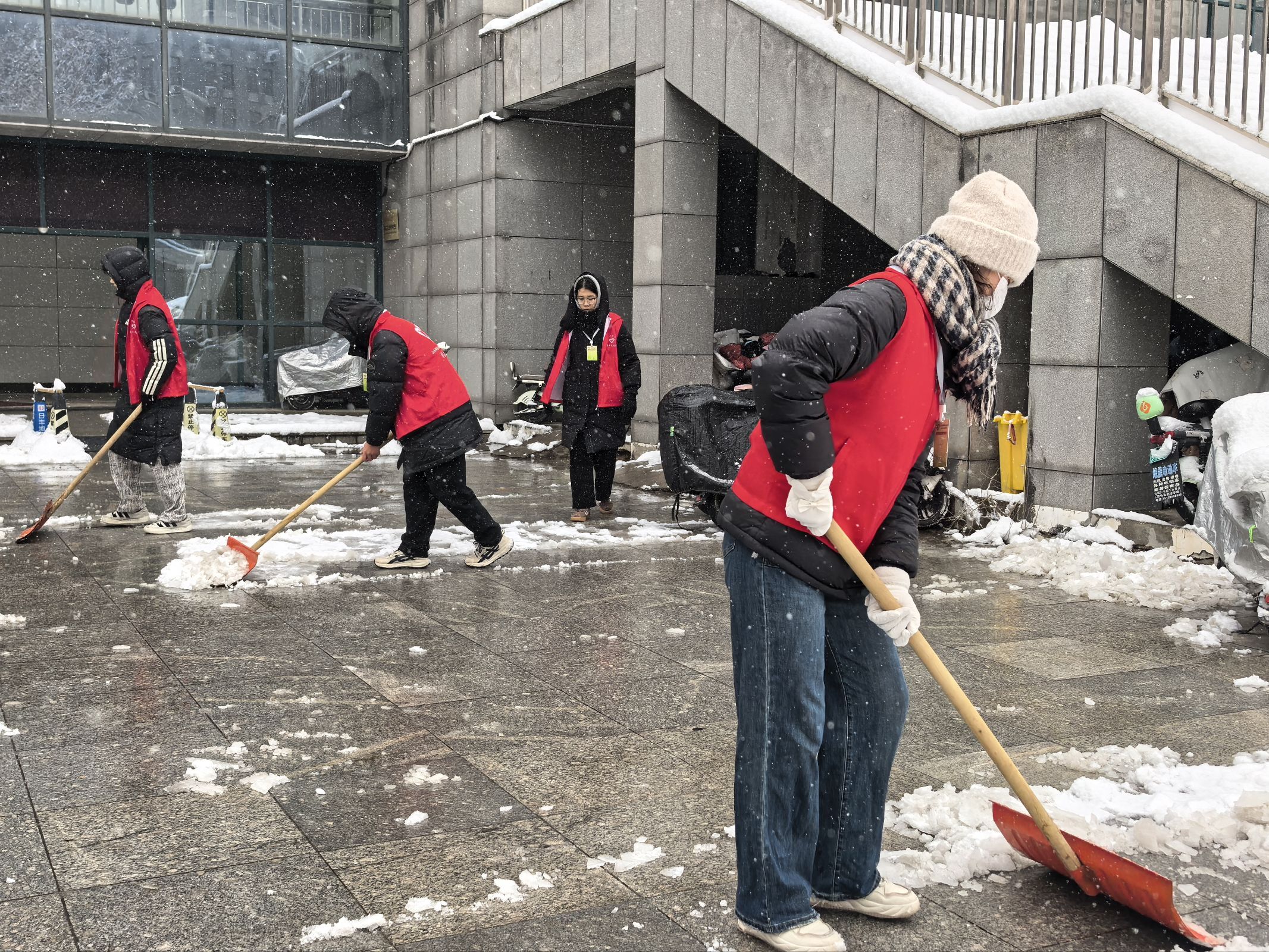 活动前期分管教师对参与志愿服务的骨干进行了安全培训,并对志愿者进行分组分工,明确各小组负责区域。随后,志愿者们携带扫帚、铁锹、除冰铲等工具迅速投入清扫工作之中。在志愿服务过程中,有的志愿者用铁锹奋力铲起积雪堆至一旁,有的党员用扫帚仔细清扫残余雪渣,还有的同学重点清理台阶、坡道等易滑区域的冻冰,大家配合默契、干劲十足。凛冽的寒风虽冻红了大家的双手和脸颊,但丝毫没有影响志愿者们的热情,现场一片热火朝天的劳动景象。