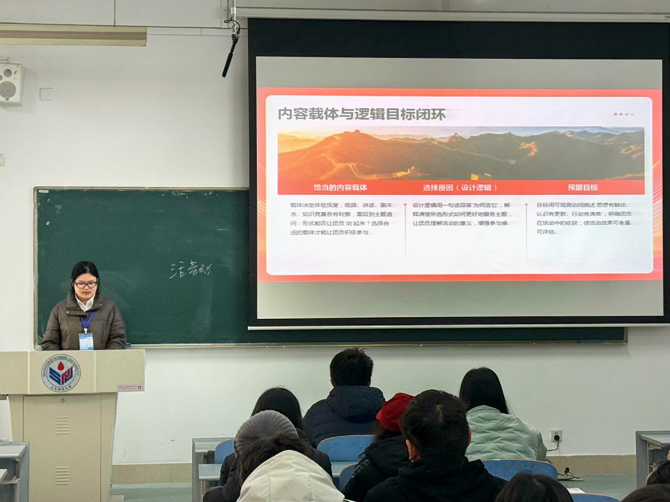 活动伊始,杨梦详细介绍了活动背景与核心目标,强调团务技能是团干部履职尽责的“基本功”与“敲门砖”,鼓励在场学员珍惜学习机会,做到学有所思、悟有所获、用有所成,将理论知识转化为推动团务工作的实践动能。随后,徐春谣以“搭建房子”为喻,生动拆解团日策划案的五大核心要点:精准拟定主题、科学选择场地、适配内容载体、明晰策划逻辑、锚定活动目标,结合学院团务工作实际案例深度解析,引导学员掌握高效策划方法。