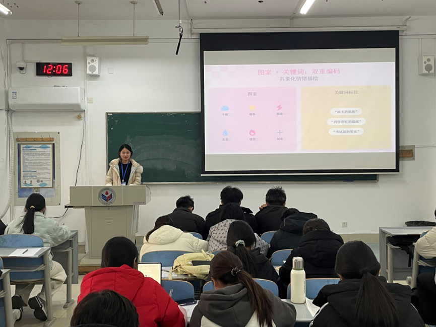 活动伊始,学员们领取绘图工具后,主讲人邰瑞雪以“地理空间定位思维”为切入点,在黑板上直观演示情绪坐标系构建方法:纵轴标注情绪强度(从微弱到强烈),横轴划分情绪类型(涵盖平静、愉悦、烦躁、焦虑等),引导学员借鉴地理学科“坐标定位”逻辑,将抽象情绪与具体事件对应至坐标系相应区域,实现情绪的具象化转译。