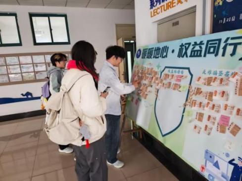 学院团委在文澜楼B区设置留言墙,同学们和老师们在“权益问答”版块中积极互动,反馈和解答日常学习生活中关心的问题;在“权益标语”“反诈宣言”板块,同学们写下“不轻信、不转账、不透露”“反诈同心,平安同行”等铿锵誓言,共同表达守护安全的坚定决心。