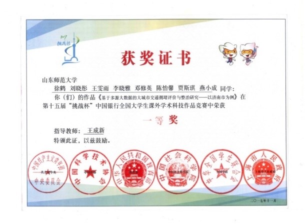 2019年11月10日,第十六届“挑战杯”国赛于北京航空航天大学顺利举行,经过层层选拔,学院共有3支队伍获得推荐国赛资格,其中程钰老师指导的《破局与重塑:共享单车发展困境与协同治理研究——基于政府—企业—公众联动视角》顺利进入国赛的终审决赛并获得全国一等奖。
