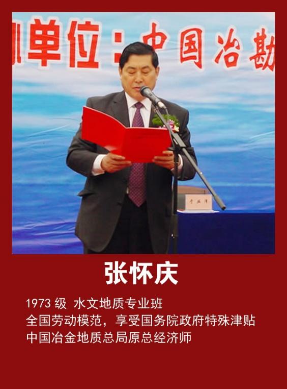 张怀庆,1973级水文地质专业校友,曾任中国冶金地质总局总经济师。长期扎根冶金地质系统,历任基层水文地质队、勘查局及总局多个重要领导职务。作为全国劳动模范和享受国务院政府特殊津贴的专家,他积极推动地质勘查与岩土工程实践,在促进地质成果转化、优化产业经济管理等方面作出重要贡献。其工作有效服务了国家矿产资源战略保障与冶金地质行业的高质量发展,展现了从技术实践到行业经济管理的复合型人才特色。