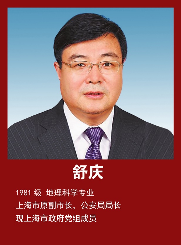 舒庆,1981级地理科学专业,上海市原副市长,公安局局长,现上海市政府党组成员。曾在原国家环境保护局工作,历任政策法规司副司长、司长、规划与财务司司长等职务,他主持和参与多项国家环境立法、环境标准体系建设与政策调研,为中国环境管理体制改革和环境法律法规体系完善作出贡献。调任上海后,他承担社会治理、法治建设、公共安全等方面的领导工作,推动公安现代化、数字治理和城市安全体系建设,并分管政府发展研究中心等部门。