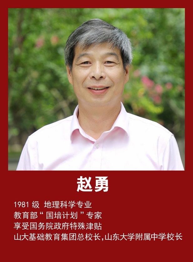 赵勇,1981级地理科学专业,教育部“国培计划”专家,享受国务院政府特殊津贴,山大基础教育集团总校长,山东大学附属中学校长。长期致力于基础教育管理与教育教学改革,在课程建设、教师培养和学校发展方面具有丰富实践经验和突出成果。在教育管理工作中,他重视学校办学特色与文化建设,倡导以学生全面发展为导向的教育理念,推动课堂教学改革和教育信息化应用,提升学校育人质量和社会影响力。作为“国培计划”专家,他积极参与国家与地方教师培训项目,为促进教师专业成长、提升教育质量提供政策与实践支持。