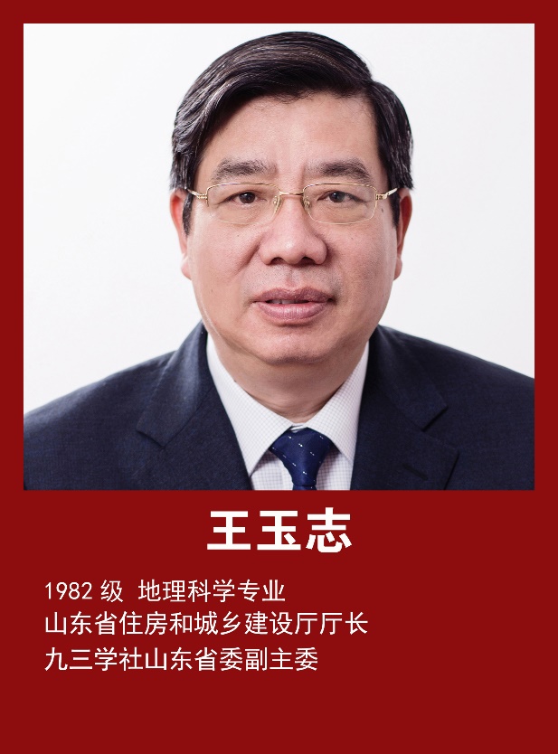 王玉志,1982级地理科学专业,现任山东省住房和城乡建设厅厅长、九三学社山东省委副主委。长期深耕土地资源管理与城市空间规划领域,主持完成《济南市土地资源调查及利用研究》《济南市城区土地定级估价》等多项重要课题,三次荣获省部级科技进步奖。出版专著两部,发表多篇学术论文,其早期研究成果为城市土地科学管理和集约利用提供了关键技术支撑。曾获评全国土地管理跨世纪专门人才、山东省优秀科技工作者等荣誉,是从土地管理领域成长起来的专家型领导干部。