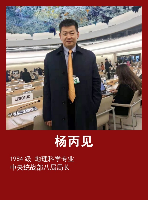 杨丙见,1984级地理科学专业,现任中共中央统一战线工作部八局党支部书记、局长,负责相关领域的统一战线工作,肩负团结联系党外人士的重要职责,领导本局党员干部贯彻执行党的路线方针政策,并具体组织实施中央关于侨务工作的各项决策部署。