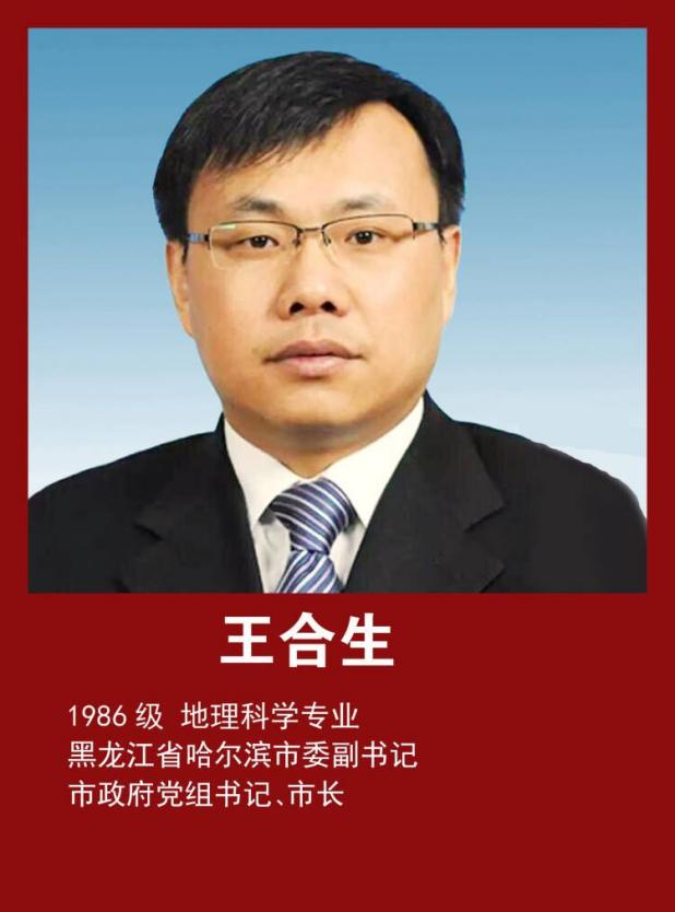 王合生,1986级地理科学专业,中共党员,理学博士,副教授,现任黑龙江省哈尔滨市委副书记,市政府党组书记、市长。曾任北京经济技术开发区研究室副主任;北京经济技术开发区发展研究与政策法规处副处长;北京经济技术开发区发展研究与法制办公室副主任;北京经济技术开发区发展研究与法制办公室主任;北京经济技术开发区发展研究与法制办公室主任、经济发展局局长;北京经济技术开发区发展和改革局局长;北京经济技术开发区管委会副主任;北京市委经济技术开发区工委委员、管委会副主任。