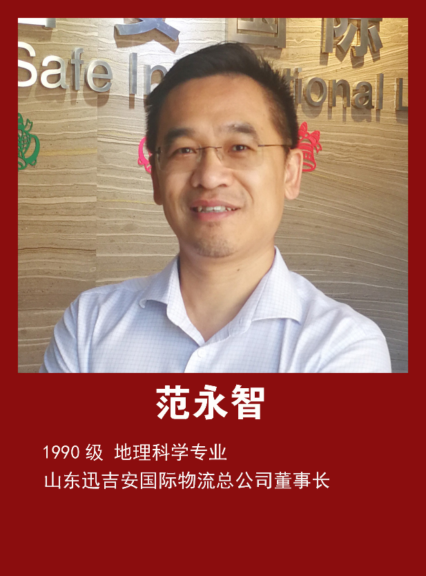 范永智,1990级地理课专业,担任山东龙宇报关行等公司法定代表人,担任山东迅吉安国际物流有限公司、青岛鼎安进出口贸易有限公司、济南易安达保税物流有限公司等公司股东,担任山东迅吉安国际物流有限公司、青岛鼎安进出口贸易有限公司、山东粼丰投资有限公司等公司高管。
